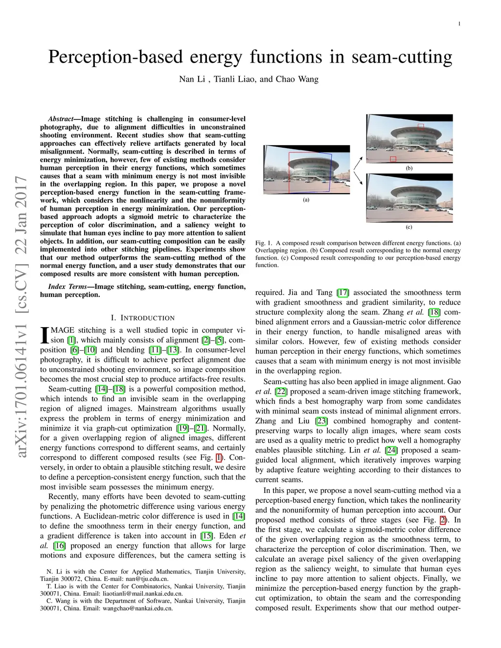 Image stitching is challenging in consumer-level photography, due to alignment difficulties in unconstrained shooting environment. Recent studies show that seam-cutting approaches can effectively relieve artifacts generated by local misalignment. Normally, seam-cutting is described in terms of energy minimization, however, few of existing methods consider human perception in their energy functions, which sometimes causes that a seam with minimum energy is not most invisible in the overlapping region. In this paper, we propose a novel perception-based energy function in the seam-cutting framework, which considers the nonlinearity and the nonuniformity of human perception in energy minimization. Our perception-based approach adopts a sigmoid metric to characterize the perception of color discrimination, and a saliency weight to simulate that human eyes incline to pay more attention to salient objects. In addition, our seam-cutting composition can be easily implemented into other stitching pipelines. Experiments show that our method outperforms the seam-cutting method of the normal energy function, and a user study demonstrates that our composed results are more consistent with human perception.