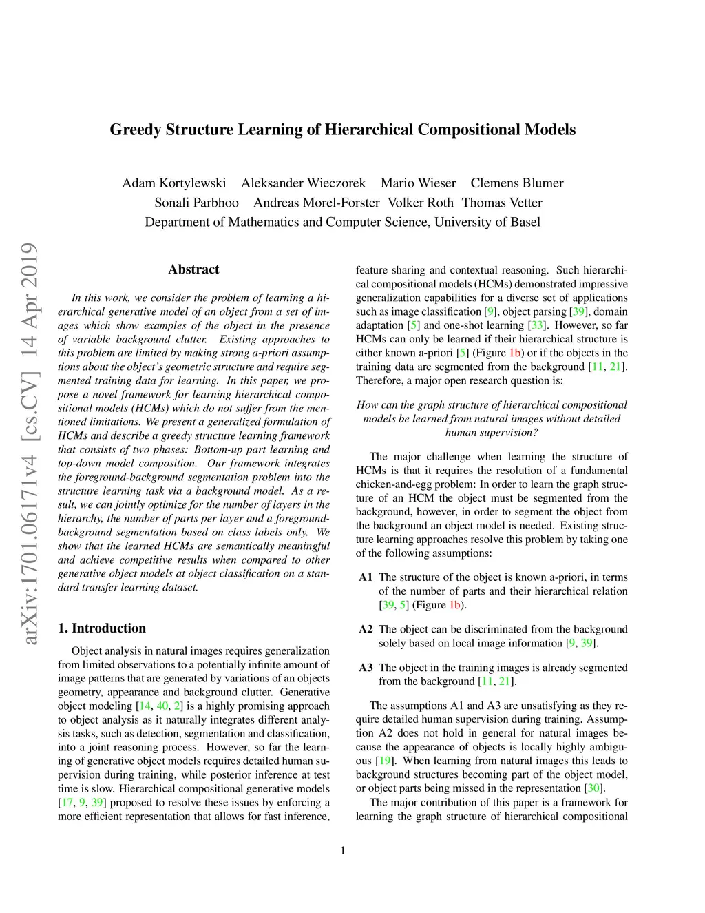 In this work, we consider the problem of learning a hierarchical generative model of an object from a set of images which show examples of the object in the presence of variable background clutter. Existing approaches to this problem are limited by making strong a-priori assumptions about the object's geometric structure and require segmented training data for learning. In this paper, we propose a novel framework for learning hierarchical compositional models (HCMs) which do not suffer from the mentioned limitations. We present a generalized formulation of HCMs and describe a greedy structure learning framework that consists of two phases: Bottom-up part learning and top-down model composition. Our framework integrates the foreground-background segmentation problem into the structure learning task via a background model. As a result, we can jointly optimize for the number of layers in the hierarchy, the number of parts per layer and a foreground-background segmentation based on class labels only. We show that the learned HCMs are semantically meaningful and achieve competitive results when compared to other generative object models at object classification on a standard transfer learning dataset.