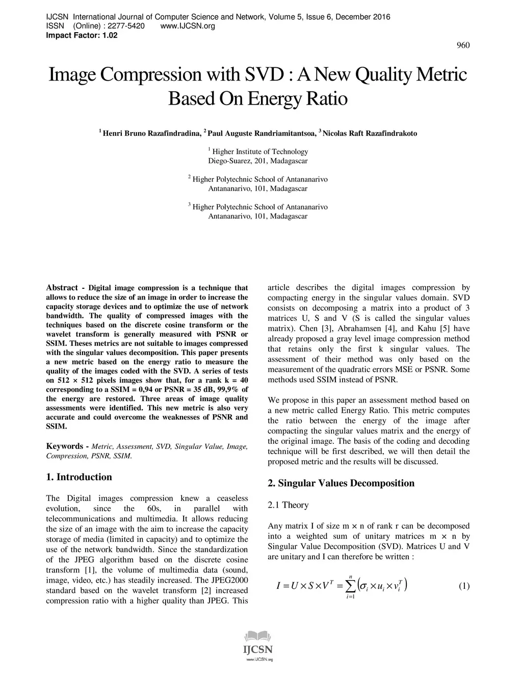 Digital image compression is a technique that allows to reduce the size of an image in order to increase the capacity storage devices and to optimize the use of network bandwidth. The quality of compressed images with the techniques based on the discrete cosine transform or the wavelet transform is generally measured with PSNR or SSIM. Theses metrics are not suitable to images compressed with the singular values decomposition. This paper presents a new metric based on the energy ratio to measure the quality of the images coded with the SVD. A series of tests on 512 * 512 pixels images show that, for a rank k = 40 corresponding to a SSIM = 0,94 or PSNR = 35 dB, 99,9% of the energy are restored. Three areas of image quality assessments were identified. This new metric is also very accurate and could overcome the weaknesses of PSNR and SSIM.