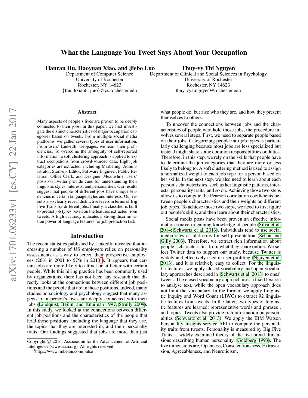 Many aspects of people's lives are proven to be deeply connected to their jobs. In this paper, we first investigate the distinct characteristics of major occupation categories based on tweets. From multiple social media platforms, we gather several types of user information. From users' LinkedIn webpages, we learn their proficiencies. To overcome the ambiguity of self-reported information, a soft clustering approach is applied to extract occupations from crowd-sourced data. Eight job categories are extracted, including Marketing, Administrator, Start-up, Editor, Software Engineer, Public Relation, Office Clerk, and Designer. Meanwhile, users' posts on Twitter provide cues for understanding their linguistic styles, interests, and personalities. Our results suggest that people of different jobs have unique tendencies in certain language styles and interests. Our results also clearly reveal distinctive levels in terms of Big Five Traits for different jobs. Finally, a classifier is built to predict job types based on the features extracted from tweets. A high accuracy indicates a strong discrimination power of language features for job prediction task.