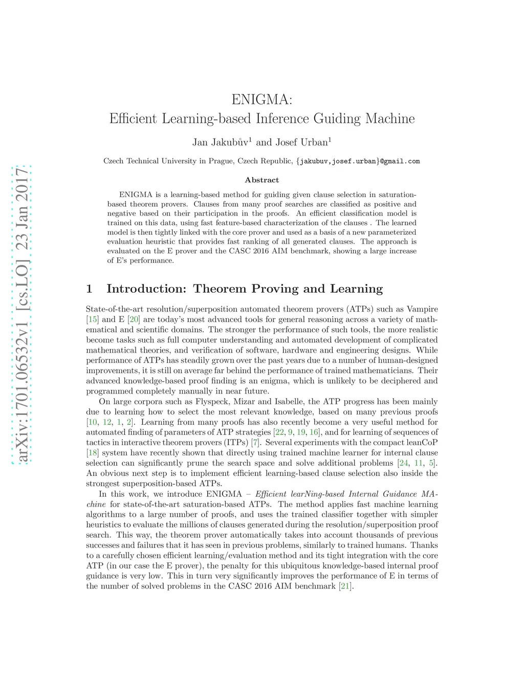 ENIGMA is a learning-based method for guiding given clause selection in saturation-based theorem provers. Clauses from many proof searches are classified as positive and negative based on their participation in the proofs. An efficient classification model is trained on this data, using fast feature-based characterization of the clauses . The learned model is then tightly linked with the core prover and used as a basis of a new parameterized evaluation heuristic that provides fast ranking of all generated clauses. The approach is evaluated on the E prover and the CASC 2016 AIM benchmark, showing a large increase of E's performance.