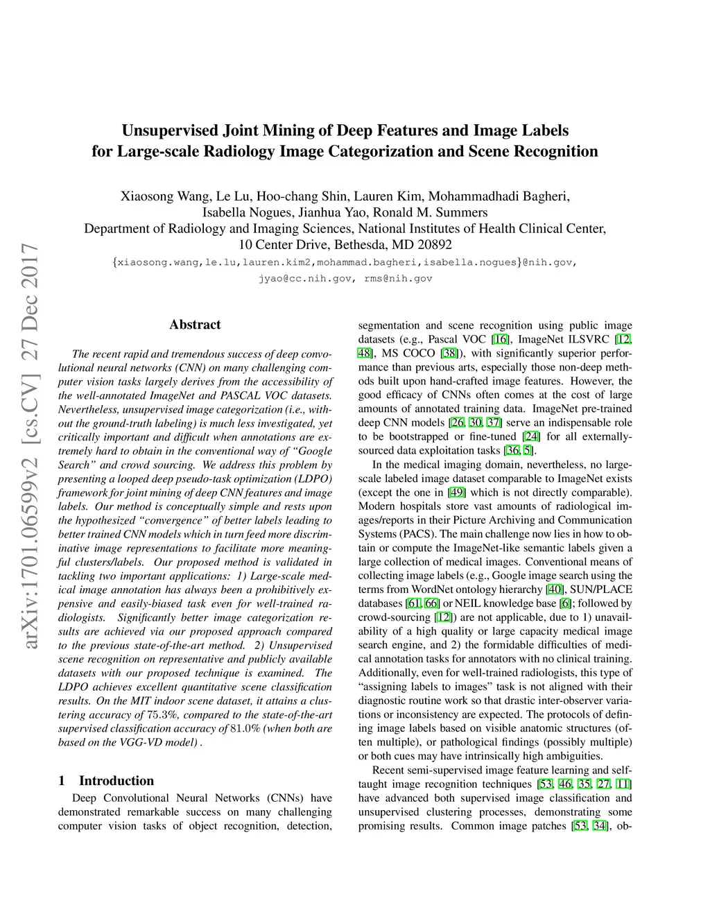 The recent rapid and tremendous success of deep convolutional neural networks (CNN) on many challenging computer vision tasks largely derives from the accessibility of the well-annotated ImageNet and PASCAL VOC datasets. Nevertheless, unsupervised image categorization (i.e., without the ground-truth labeling) is much less investigated, yet critically important and difficult when annotations are extremely hard to obtain in the conventional way of "Google Search" and crowd sourcing. We address this problem by presenting a looped deep pseudo-task optimization (LDPO) framework for joint mining of deep CNN features and image labels. Our method is conceptually simple and rests upon the hypothesized "convergence" of better labels leading to better trained CNN models which in turn feed more discriminative image representations to facilitate more meaningful clusters/labels. Our proposed method is validated in tackling two important applications: 1) Large-scale medical image annotation has always been a prohibitively expensive and easily-biased task even for well-trained radiologists. Significantly better image categorization results are achieved via our proposed approach compared to the previous state-of-the-art method. 2) Unsupervised scene recognition on representative and publicly available datasets with our proposed technique is examined. The LDPO achieves excellent quantitative scene classification results. On the MIT indoor scene dataset, it attains a clustering accuracy of 75.3%, compared to the state-of-the-art supervised classification accuracy of 81.0% (when both are based on the VGG-VD model).