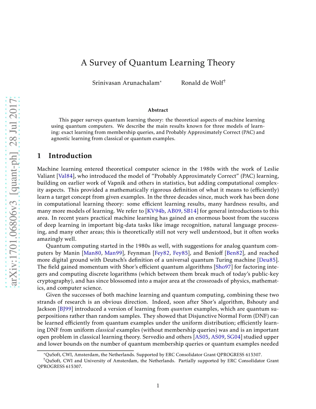 This paper surveys quantum learning theory: the theoretical aspects of machine learning using quantum computers. We describe the main results known for three models of learning: exact learning from membership queries, and Probably Approximately Correct (PAC) and agnostic learning from classical or quantum examples.