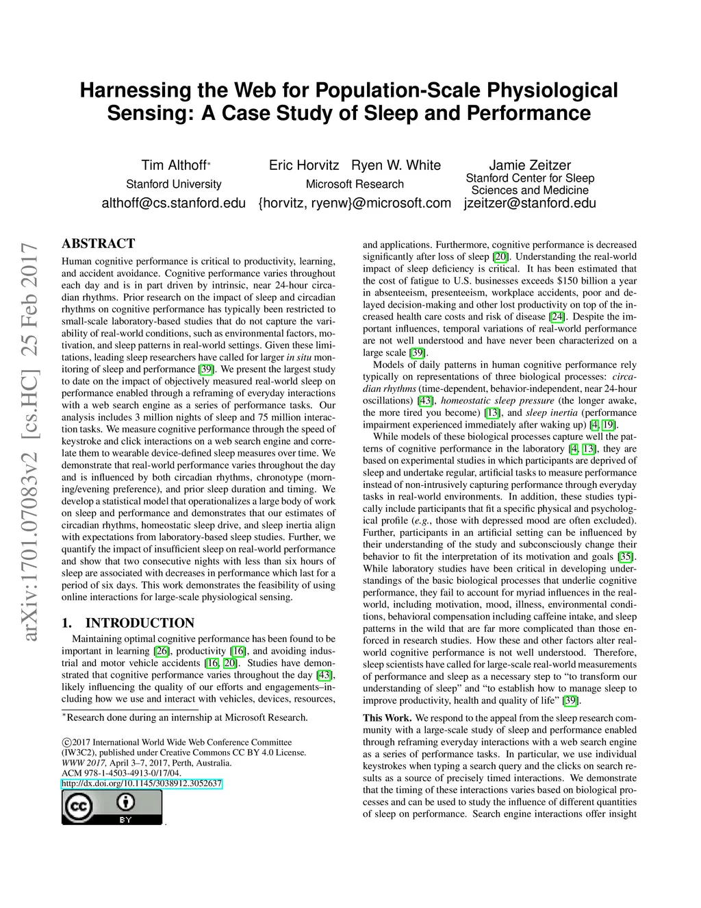 Human cognitive performance is critical to productivity, learning, and accident avoidance. Cognitive performance varies throughout each day and is in part driven by intrinsic, near 24-hour circadian rhythms. Prior research on the impact of sleep and circadian rhythms on cognitive performance has typically been restricted to small-scale laboratory-based studies that do not capture the variability of real-world conditions, such as environmental factors, motivation, and sleep patterns in real-world settings. Given these limitations, leading sleep researchers have called for larger in situ monitoring of sleep and performance. We present the largest study to date on the impact of objectively measured real-world sleep on performance enabled through a reframing of everyday interactions with a web search engine as a series of performance tasks. Our analysis includes 3 million nights of sleep and 75 million interaction tasks. We measure cognitive performance through the speed of keystroke and click interactions on a web search engine and correlate them to wearable device-defined sleep measures over time. We demonstrate that real-world performance varies throughout the day and is influenced by both circadian rhythms, chronotype (morning/evening preference), and prior sleep duration and timing. We develop a statistical model that operationalizes a large body of work on sleep and performance and demonstrates that our estimates of circadian rhythms, homeostatic sleep drive, and sleep inertia align with expectations from laboratory-based sleep studies. Further, we quantify the impact of insufficient sleep on real-world performance and show that two consecutive nights with less than six hours of sleep are associated with decreases in performance which last for a period of six days. This work demonstrates the feasibility of using online interactions for large-scale physiological sensing.
