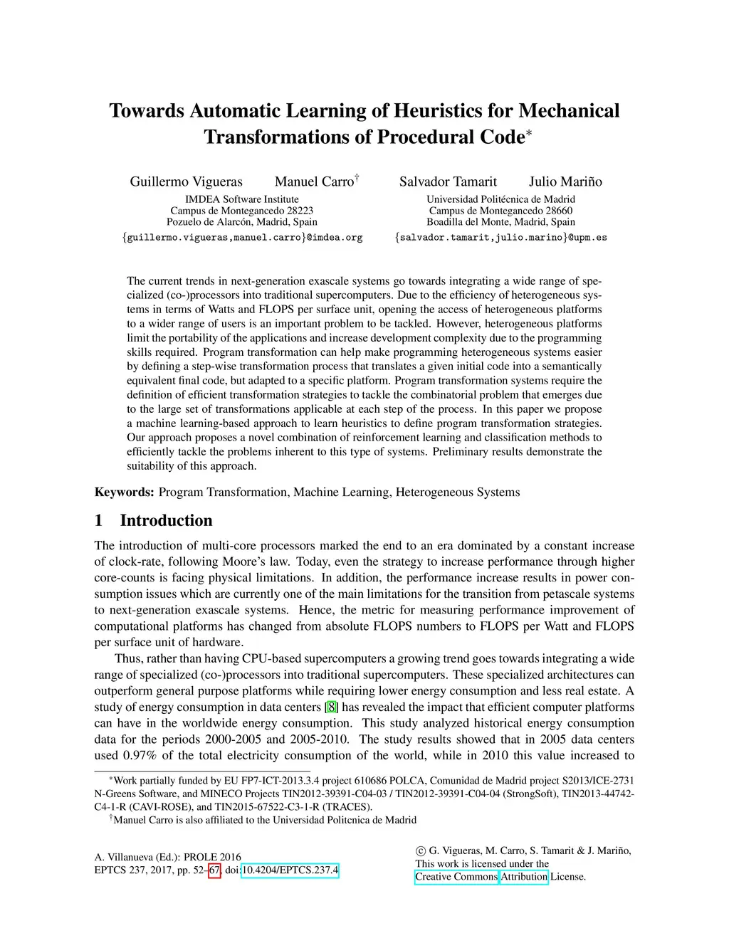 The current trends in next-generation exascale systems go towards integrating a wide range of specialized (co-)processors into traditional supercomputers. Due to the efficiency of heterogeneous systems in terms of Watts and FLOPS per surface unit, opening the access of heterogeneous platforms to a wider range of users is an important problem to be tackled. However, heterogeneous platforms limit the portability of the applications and increase development complexity due to the programming skills required. Program transformation can help make programming heterogeneous systems easier by defining a step-wise transformation process that translates a given initial code into a semantically equivalent final code, but adapted to a specific platform. Program transformation systems require the definition of efficient transformation strategies to tackle the combinatorial problem that emerges due to the large set of transformations applicable at each step of the process. In this paper we propose a machine learning-based approach to learn heuristics to define program transformation strategies. Our approach proposes a novel combination of reinforcement learning and classification methods to efficiently tackle the problems inherent to this type of systems. Preliminary results demonstrate the suitability of this approach.