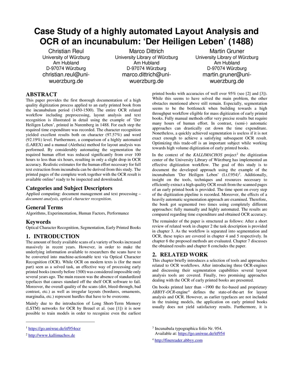 This paper provides the first thorough documentation of a high quality digitization process applied to an early printed book from the incunabulum period (1450-1500). The entire OCR related workflow including preprocessing, layout analysis and text recognition is illustrated in detail using the example of 'Der Heiligen Leben', printed in Nuremberg in 1488. For each step the required time expenditure was recorded. The character recognition yielded excellent results both on character (97.57%) and word (92.19%) level. Furthermore, a comparison of a highly automated (LAREX) and a manual (Aletheia) method for layout analysis was performed. By considerably automating the segmentation the required human effort was reduced significantly from over 100 hours to less than six hours, resulting in only a slight drop in OCR accuracy. Realistic estimates for the human effort necessary for full text extraction from incunabula can be derived from this study. The printed pages of the complete work together with the OCR result is available online ready to be inspected and downloaded.