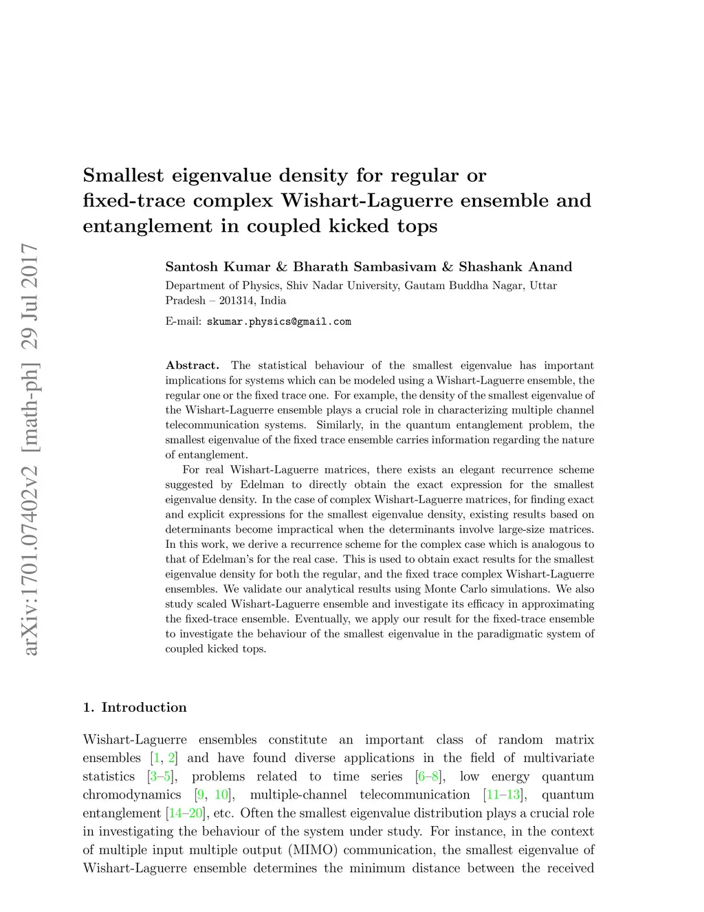 The statistical behaviour of the smallest eigenvalue has important implications for systems which can be modeled using a Wishart-Laguerre ensemble, the regular one or the fixed trace one. For example, the density of the smallest eigenvalue of the Wishart-Laguerre ensemble plays a crucial role in characterizing multiple channel telecommunication systems. Similarly, in the quantum entanglement problem, the smallest eigenvalue of the fixed trace ensemble carries information regarding the nature of entanglement. For real Wishart-Laguerre matrices, there exists an elegant recurrence scheme suggested by Edelman to directly obtain the exact expression for the smallest eigenvalue density. In the case of complex Wishart-Laguerre matrices, for finding exact and explicit expressions for the smallest eigenvalue density, existing results based on determinants become impractical when the determinants involve large-size matrices. In this work, we derive a recurrence scheme for the complex case which is analogous to that of Edelman's for the real case. This is used to obtain exact results for the smallest eigenvalue density for both the regular, and the fixed trace complex Wishart-Laguerre ensembles. We validate our analytical results using Monte Carlo simulations. We also study scaled Wishart-Laguerre ensemble and investigate its efficacy in approximating the fixed-trace ensemble. Eventually, we apply our result for the fixed-trace ensemble to investigate the behaviour of the smallest eigenvalue in the paradigmatic system of coupled kicked tops.