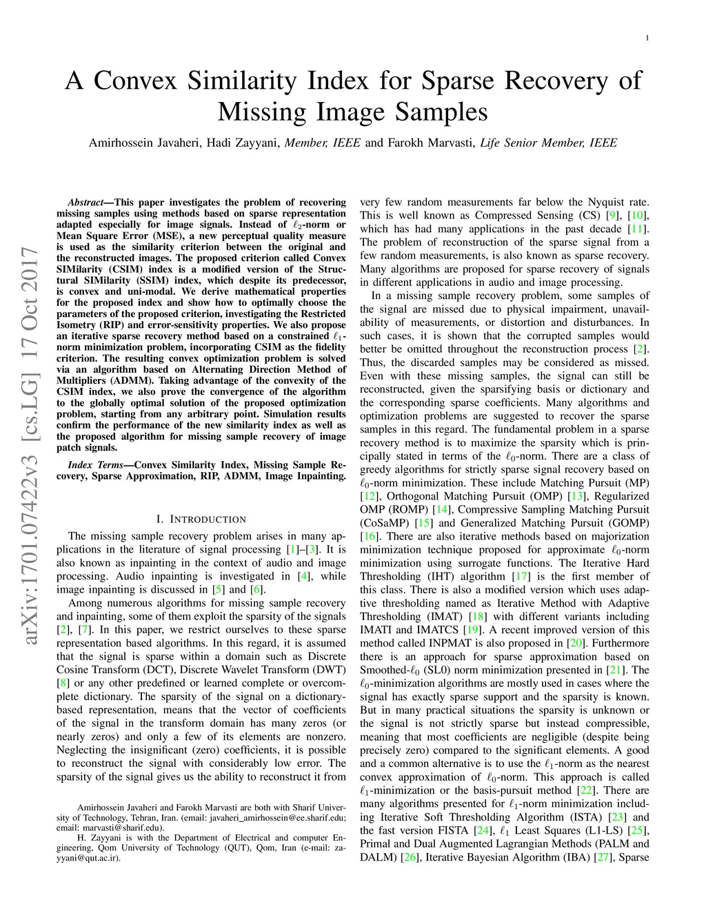 A Convex Similarity Index for Sparse Recovery of Missing Image Samples