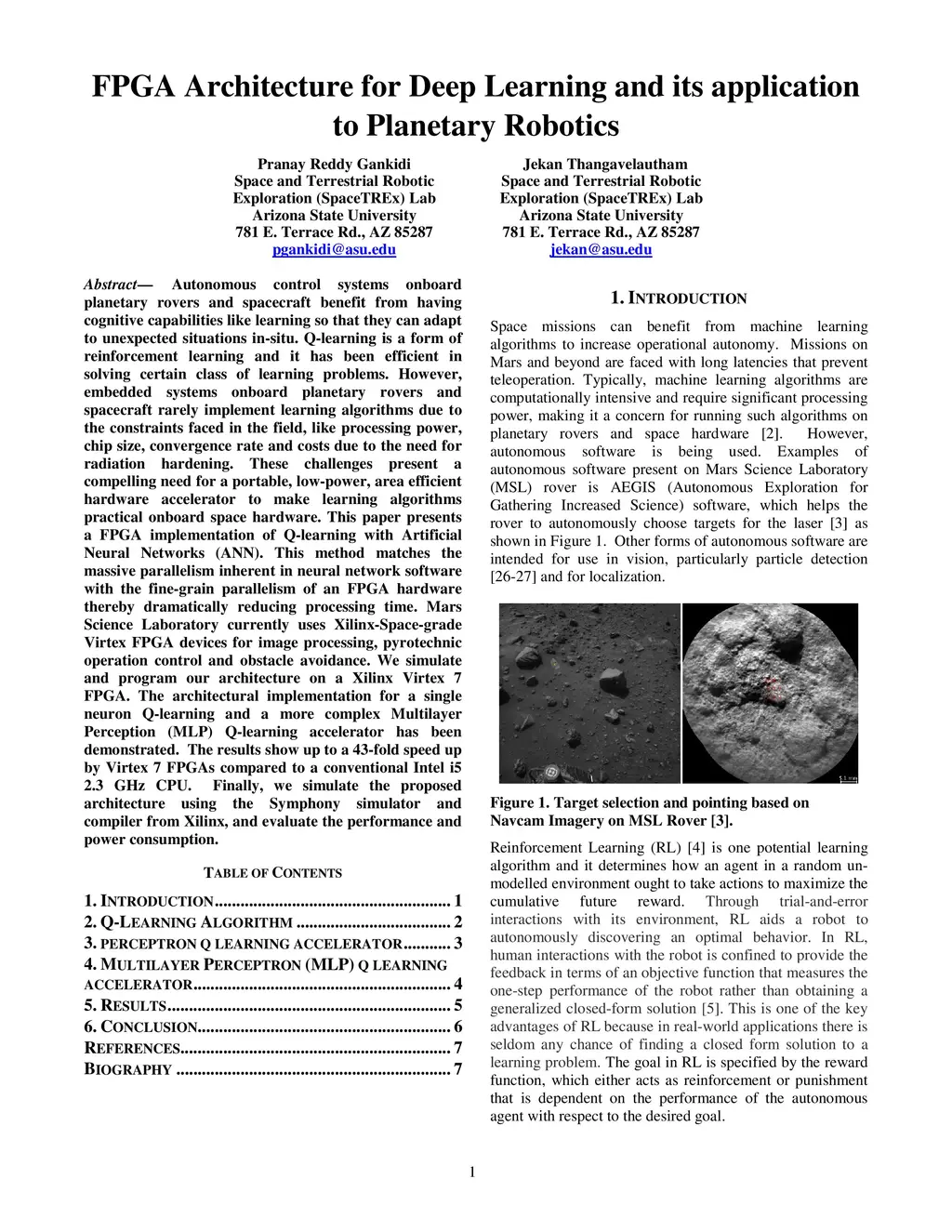 Autonomous control systems onboard planetary rovers and spacecraft benefit from having cognitive capabilities like learning so that they can adapt to unexpected situations in-situ. Q-learning is a form of reinforcement learning and it has been efficient in solving certain class of learning problems. However, embedded systems onboard planetary rovers and spacecraft rarely implement learning algorithms due to the constraints faced in the field, like processing power, chip size, convergence rate and costs due to the need for radiation hardening. These challenges present a compelling need for a portable, low-power, area efficient hardware accelerator to make learning algorithms practical onboard space hardware. This paper presents a FPGA implementation of Q-learning with Artificial Neural Networks (ANN). This method matches the massive parallelism inherent in neural network software with the fine-grain parallelism of an FPGA hardware thereby dramatically reducing processing time. Mars Science Laboratory currently uses Xilinx-Space-grade Virtex FPGA devices for image processing, pyrotechnic operation control and obstacle avoidance. We simulate and program our architecture on a Xilinx Virtex 7 FPGA. The architectural implementation for a single neuron Q-learning and a more complex Multilayer Perception (MLP) Q-learning accelerator has been demonstrated. The results show up to a 43-fold speed up by Virtex 7 FPGAs compared to a conventional Intel i5 2.3 GHz CPU. Finally, we simulate the proposed architecture using the Symphony simulator and compiler from Xilinx, and evaluate the performance and power consumption.