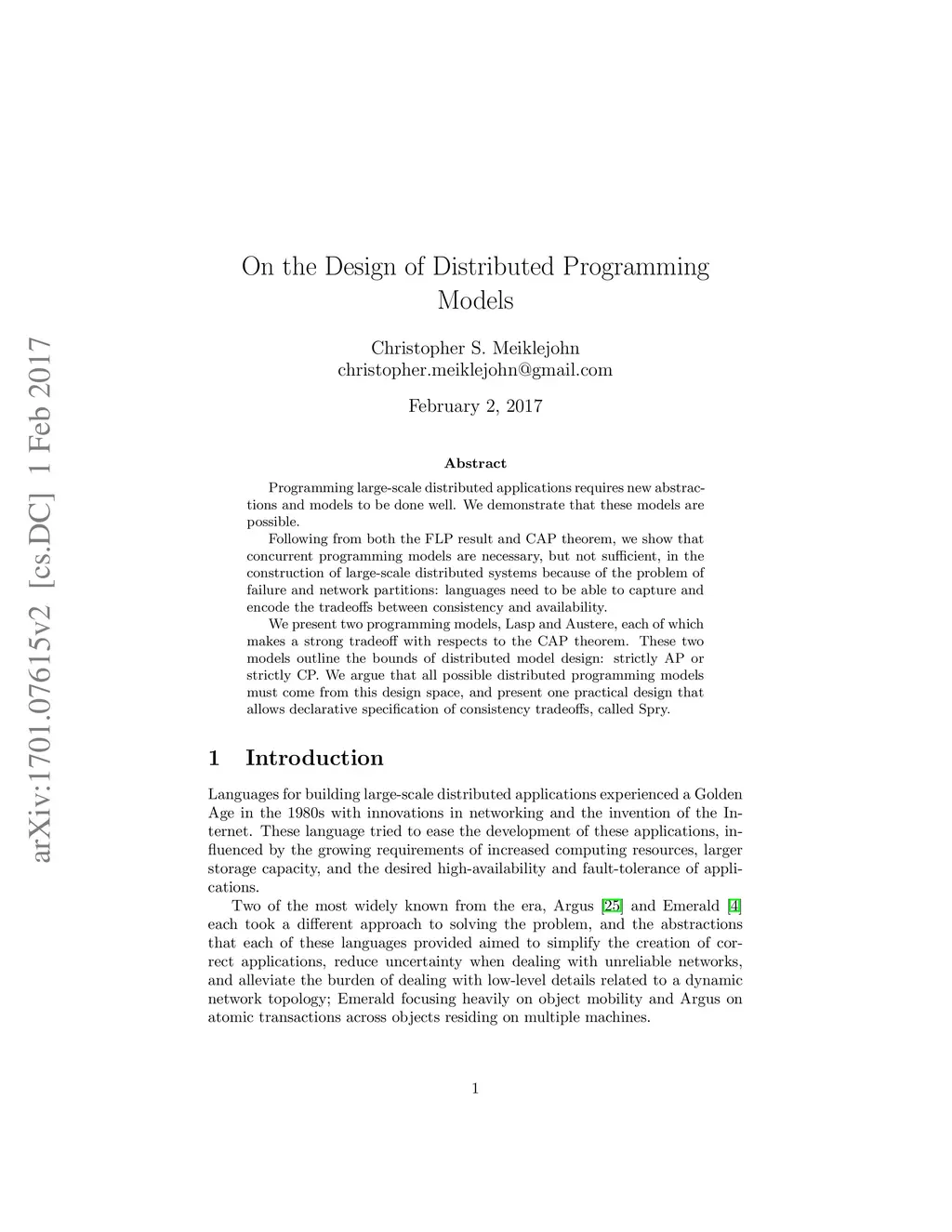Programming large-scale distributed applications requires new abstractions and models to be done well. We demonstrate that these models are possible. Following from both the FLP result and CAP theorem, we show that concurrent programming models are necessary, but not sufficient, in the construction of large-scale distributed systems because of the problem of failure and network partitions: languages need to be able to capture and encode the tradeoffs between consistency and availability. We present two programming models, Lasp and Austere, each of which makes a strong tradeoff with respects to the CAP theorem. These two models outline the bounds of distributed model design: strictly AP or strictly CP. We argue that all possible distributed programming models must come from this design space, and present one practical design that allows declarative specification of consistency tradeoffs, called Spry.