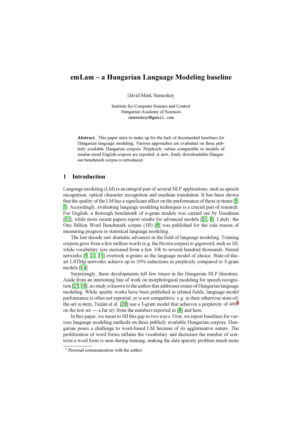emLam -- a Hungarian Language Modeling baseline