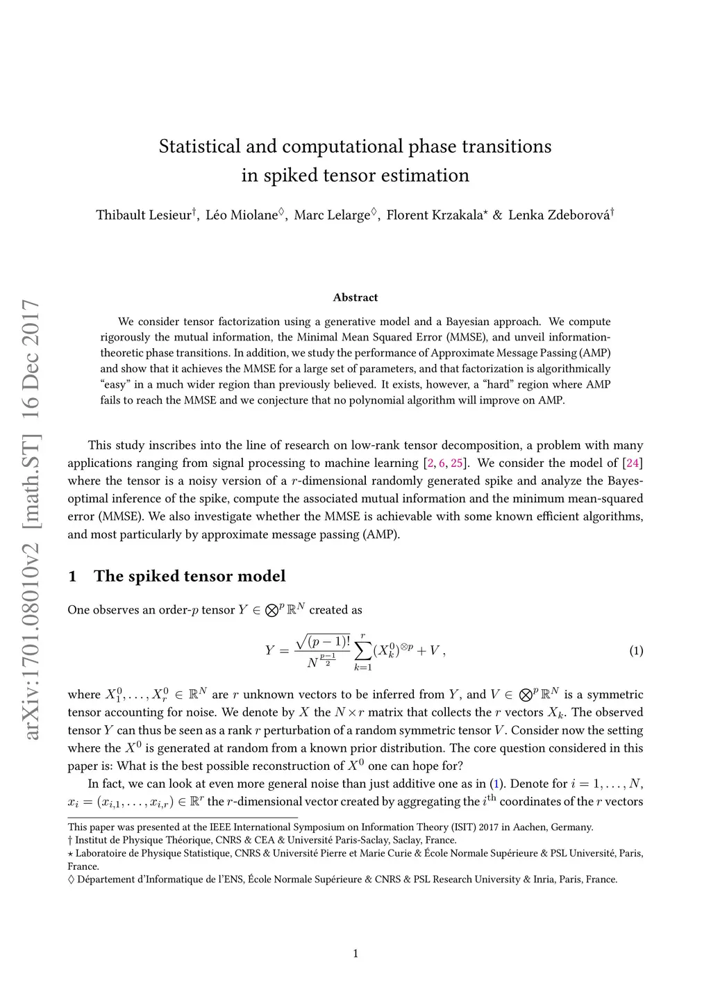 We consider tensor factorizations using a generative model and a Bayesian approach. We compute rigorously the mutual information, the Minimal Mean Squared Error (MMSE), and unveil information-theoretic phase transitions. In addition, we study the performance of Approximate Message Passing (AMP) and show that it achieves the MMSE for a large set of parameters, and that factorization is algorithmically "easy" in a much wider region than previously believed. It exists, however, a "hard" region where AMP fails to reach the MMSE and we conjecture that no polynomial algorithm will improve on AMP.