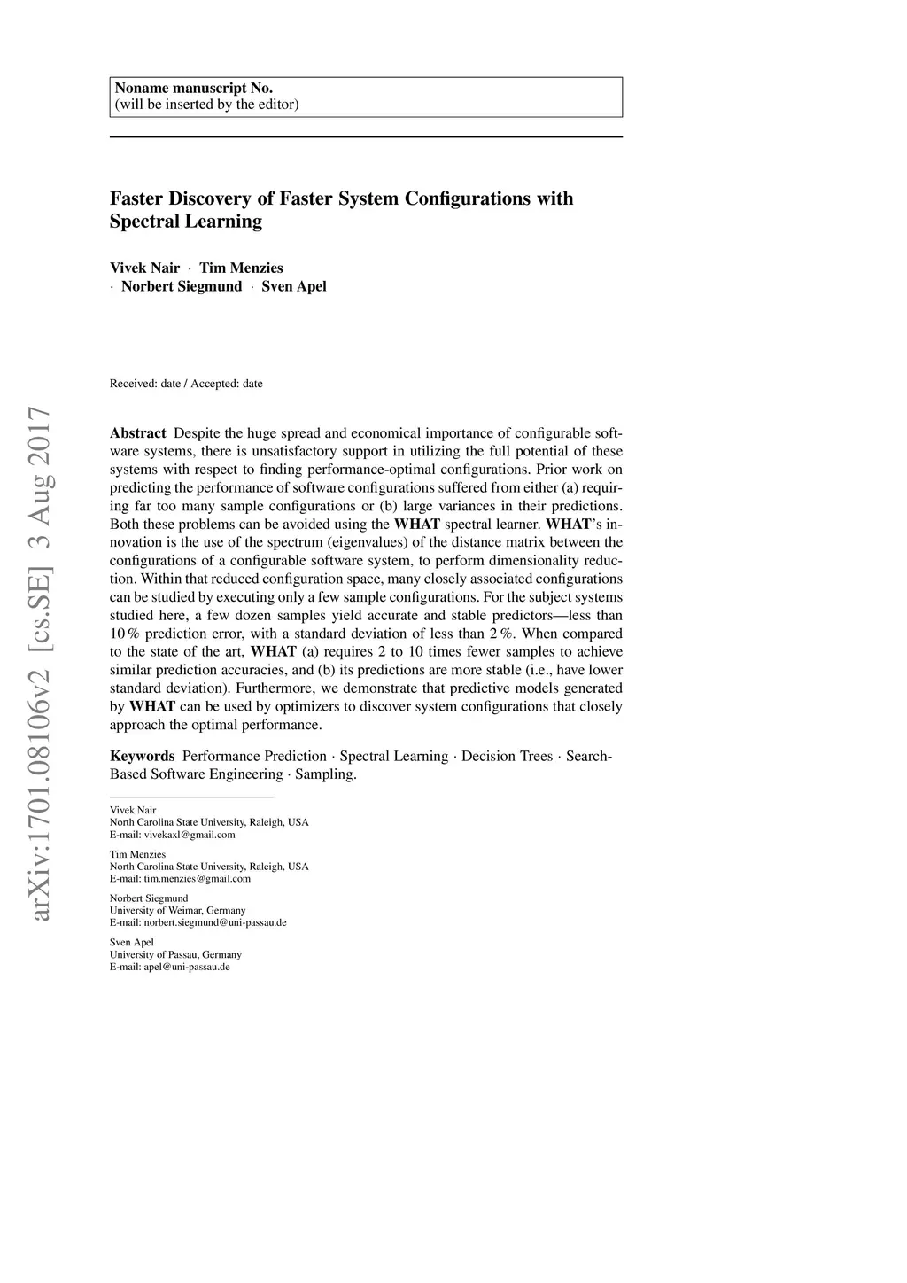 Despite the huge spread and economical importance of configurable software systems, there is unsatisfactory support in utilizing the full potential of these systems with respect to finding performance-optimal configurations. Prior work on predicting the performance of software configurations suffered from either (a) requiring far too many sample configurations or (b) large variances in their predictions. Both these problems can be avoided using the WHAT spectral learner. WHAT's innovation is the use of the spectrum (eigenvalues) of the distance matrix between the configurations of a configurable software system, to perform dimensionality reduction. Within that reduced configuration space, many closely associated configurations can be studied by executing only a few sample configurations. For the subject systems studied here, a few dozen samples yield accurate and stable predictors - less than 10% prediction error, with a standard deviation of less than 2%. When compared to the state of the art, WHAT (a) requires 2 to 10 times fewer samples to achieve similar prediction accuracies, and (b) its predictions are more stable (i.e., have lower standard deviation). Furthermore, we demonstrate that predictive models generated by WHAT can be used by optimizers to discover system configurations that closely approach the optimal performance.