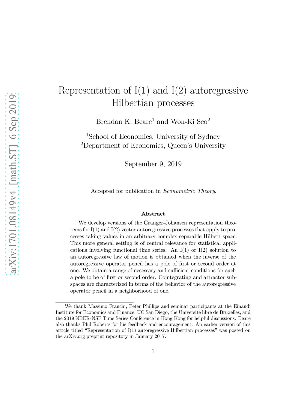 We extend the Granger-Johansen representation theorems for I(1) and I(2) vector autoregressive processes to accommodate processes that take values in an arbitrary complex separable Hilbert space. This more general setting is of central relevance for statistical applications involving functional time series. We first obtain a range of necessary and sufficient conditions for a pole in the inverse of a holomorphic index-zero Fredholm operator pencil to be of first or second order. Those conditions form the basis for our development of I(1) and I(2) representations of autoregressive Hilbertian processes. Cointegrating and attractor subspaces are characterized in terms of the behavior of the autoregressive operator pencil in a neighborhood of one.