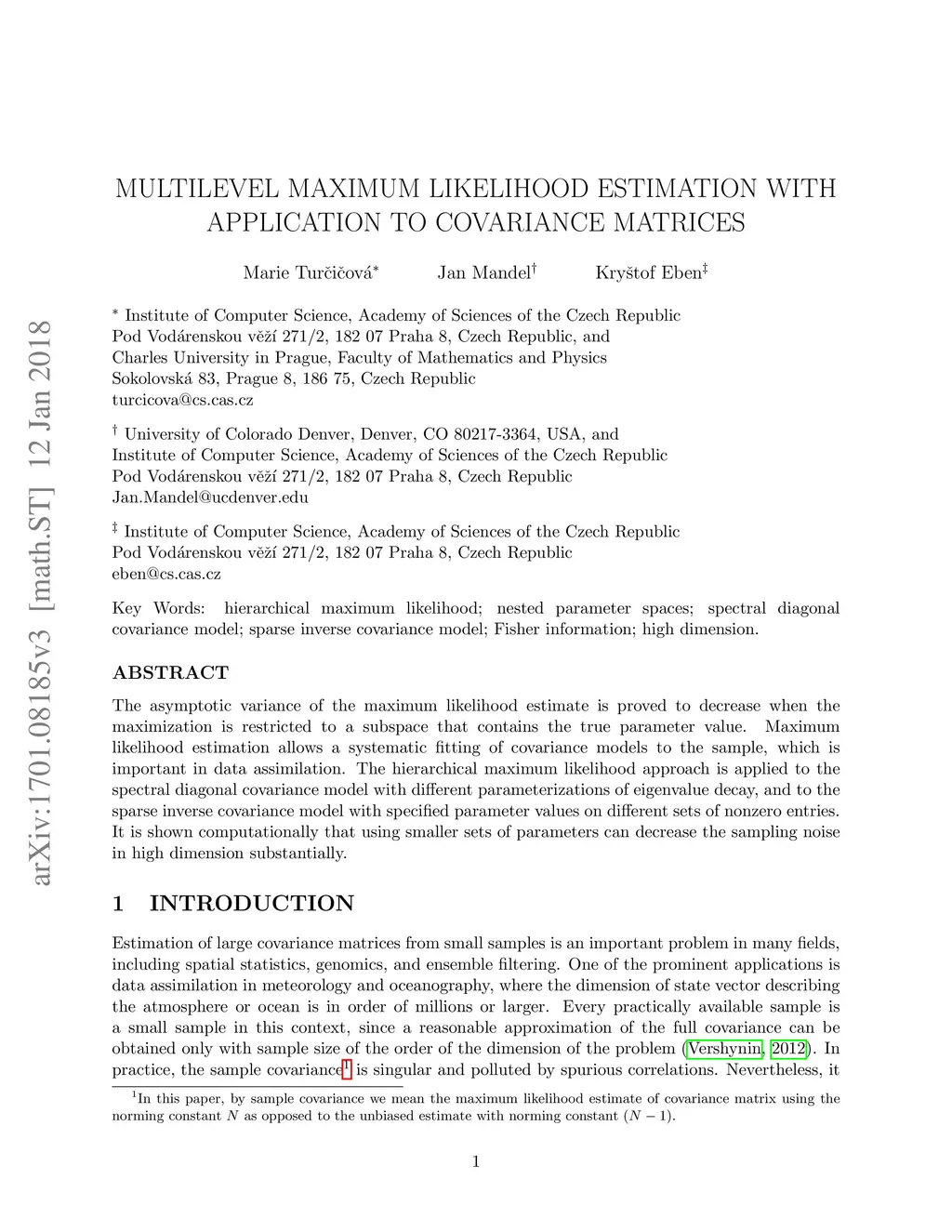 The asymptotic variance of the maximum likelihood estimate is proved to decrease when the maximization is restricted to a subspace that contains the true parameter value. Maximum likelihood estimation allows a systematic fitting of covariance models to the sample, which is important in data assimilation. The hierarchical maximum likelihood approach is applied to the spectral diagonal covariance model with different parameterizations of eigenvalue decay, and to the sparse inverse covariance model with specified parameter values on different sets of nonzero entries. It is shown computationally that using smaller sets of parameters can decrease the sampling noise in high dimension substantially.