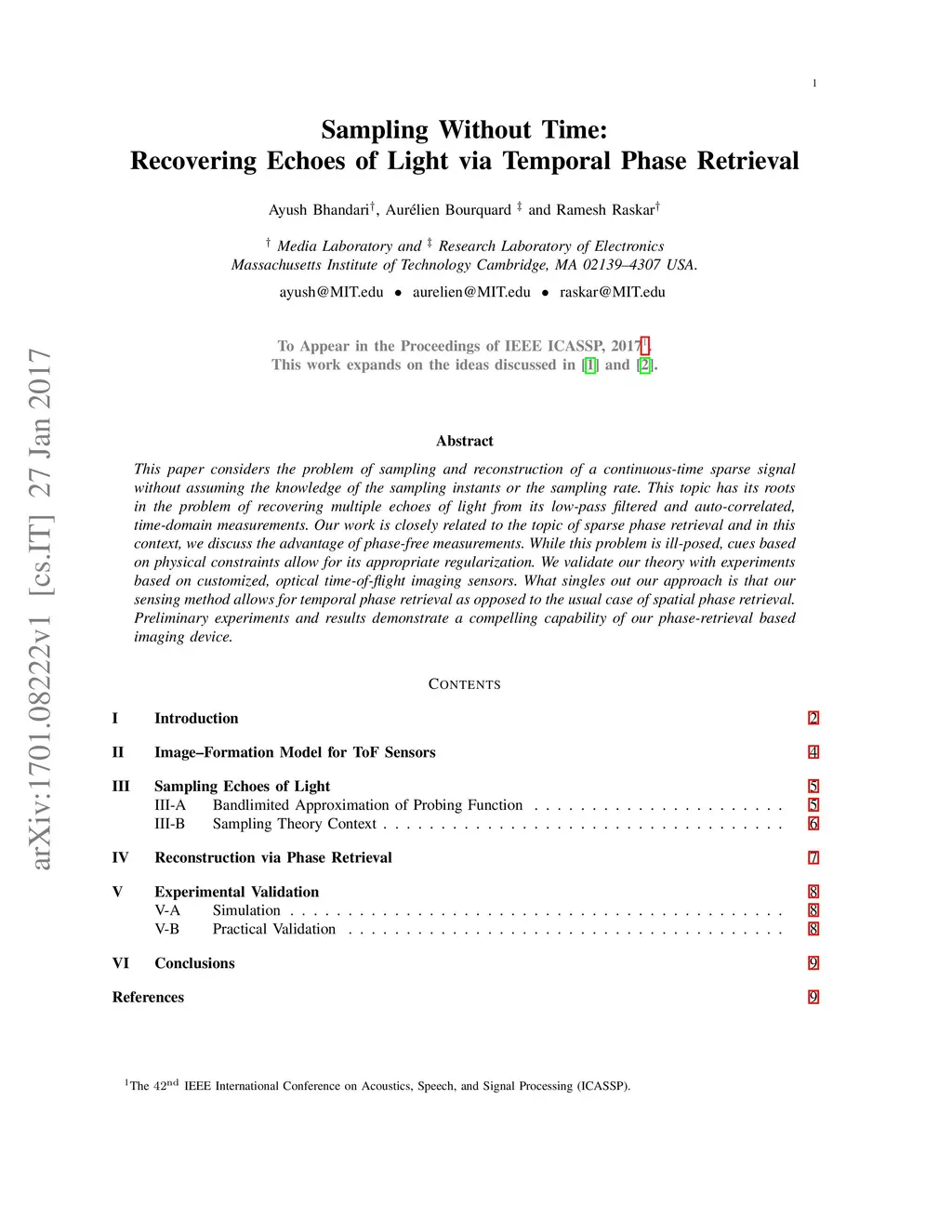 This paper considers the problem of sampling and reconstruction of a continuous-time sparse signal without assuming the knowledge of the sampling instants or the sampling rate. This topic has its roots in the problem of recovering multiple echoes of light from its low-pass filtered and auto-correlated, time-domain measurements. Our work is closely related to the topic of sparse phase retrieval and in this context, we discuss the advantage of phase-free measurements. While this problem is ill-posed, cues based on physical constraints allow for its appropriate regularization. We validate our theory with experiments based on customized, optical time-of-flight imaging sensors. What singles out our approach is that our sensing method allows for temporal phase retrieval as opposed to the usual case of spatial phase retrieval. Preliminary experiments and results demonstrate a compelling capability of our phase-retrieval based imaging device.