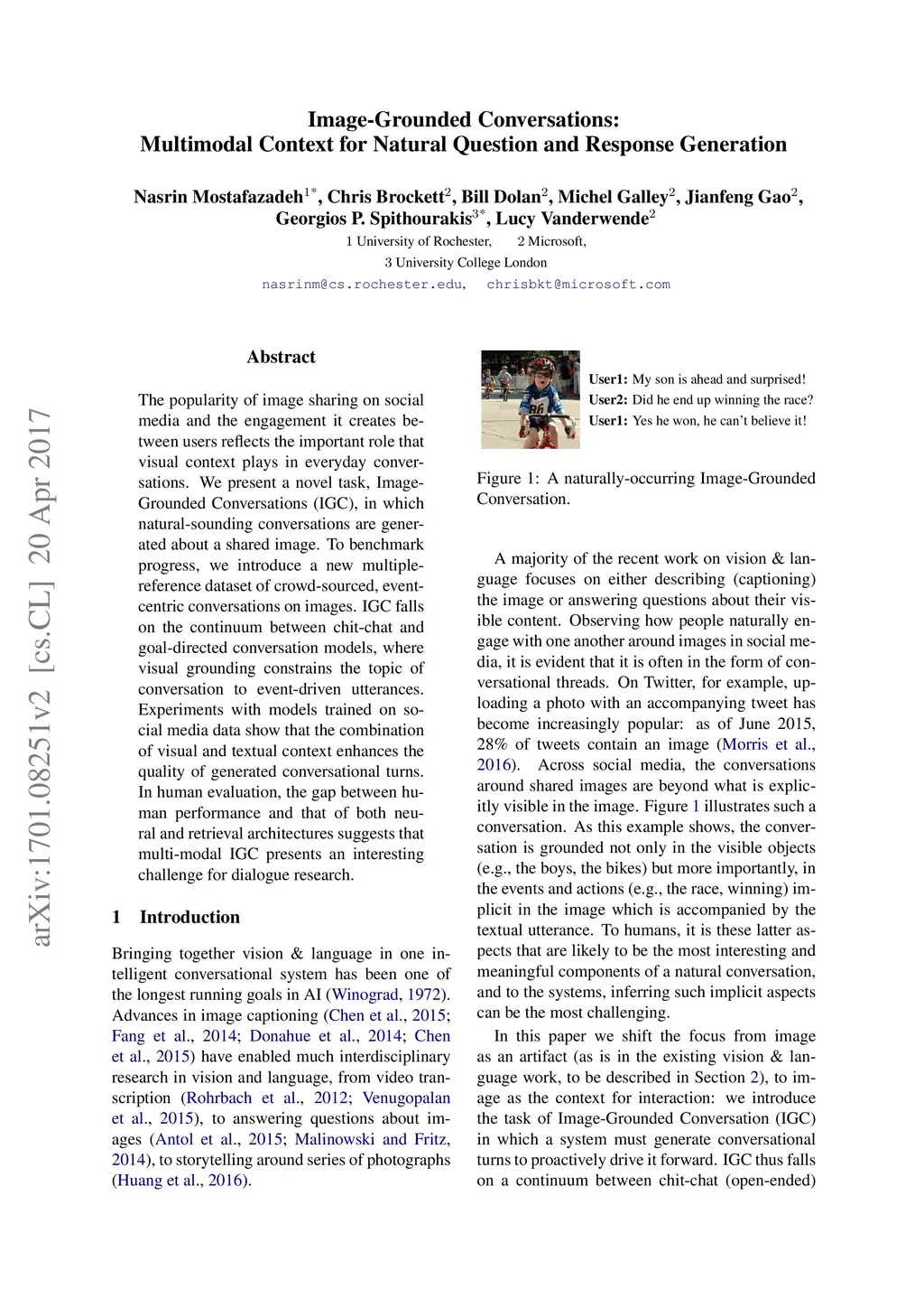 The popularity of image sharing on social media and the engagement it creates between users reflects the important role that visual context plays in everyday conversations. We present a novel task, Image-Grounded Conversations (IGC), in which natural-sounding conversations are generated about a shared image. To benchmark progress, we introduce a new multiple-reference dataset of crowd-sourced, event-centric conversations on images. IGC falls on the continuum between chit-chat and goal-directed conversation models, where visual grounding constrains the topic of conversation to event-driven utterances. Experiments with models trained on social media data show that the combination of visual and textual context enhances the quality of generated conversational turns. In human evaluation, the gap between human performance and that of both neural and retrieval architectures suggests that multi-modal IGC presents an interesting challenge for dialogue research.
