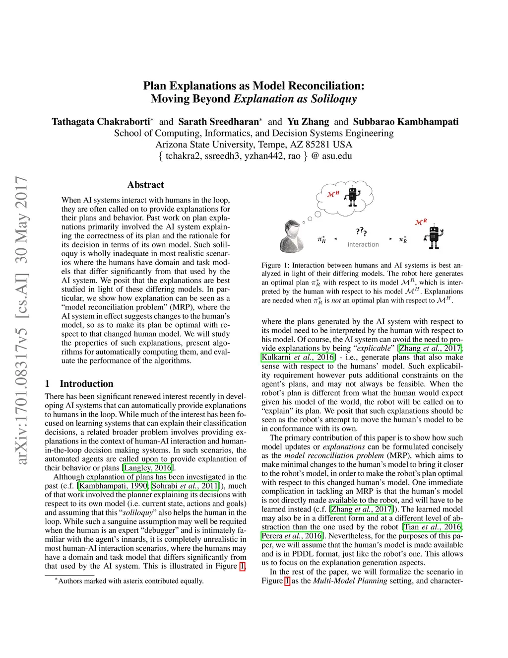 When AI systems interact with humans in the loop, they are often called on to provide explanations for their plans and behavior. Past work on plan explanations primarily involved the AI system explaining the correctness of its plan and the rationale for its decision in terms of its own model. Such soliloquy is wholly inadequate in most realistic scenarios where the humans have domain and task models that differ significantly from that used by the AI system. We posit that the explanations are best studied in light of these differing models. In particular, we show how explanation can be seen as a "model reconciliation problem" (MRP), where the AI system in effect suggests changes to the human's model, so as to make its plan be optimal with respect to that changed human model. We will study the properties of such explanations, present algorithms for automatically computing them, and evaluate the performance of the algorithms.