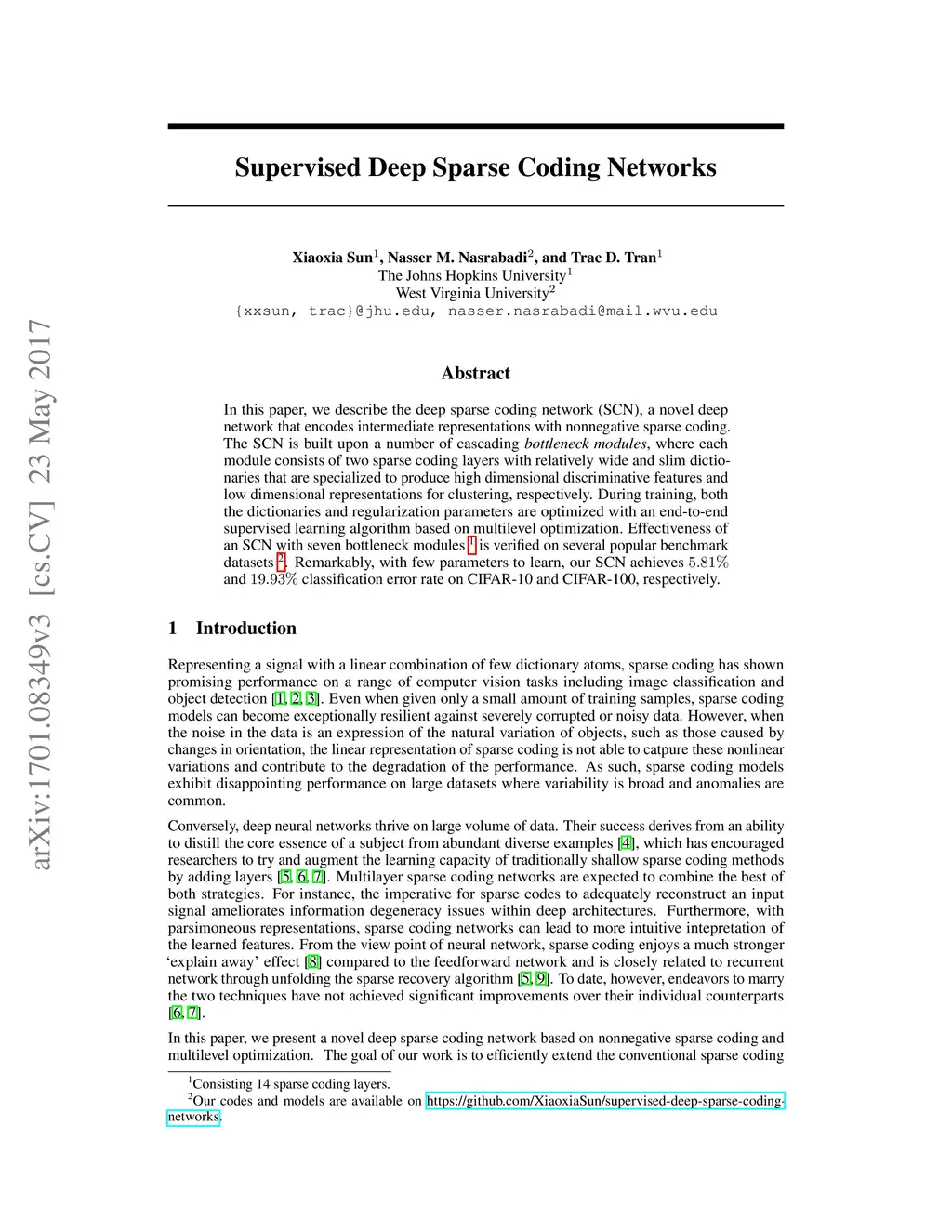 In this paper, we describe the deep sparse coding network (SCN), a novel deep network that encodes intermediate representations with nonnegative sparse coding. The SCN is built upon a number of cascading bottleneck modules, where each module consists of two sparse coding layers with relatively wide and slim dictionaries that are specialized to produce high dimensional discriminative features and low dimensional representations for clustering, respectively. During training, both the dictionaries and regularization parameters are optimized with an end-to-end supervised learning algorithm based on multilevel optimization. Effectiveness of an SCN with seven bottleneck modules is verified on several popular benchmark datasets. Remarkably, with few parameters to learn, our SCN achieves 5.81% and 19.93% classification error rate on CIFAR-10 and CIFAR-100, respectively.
