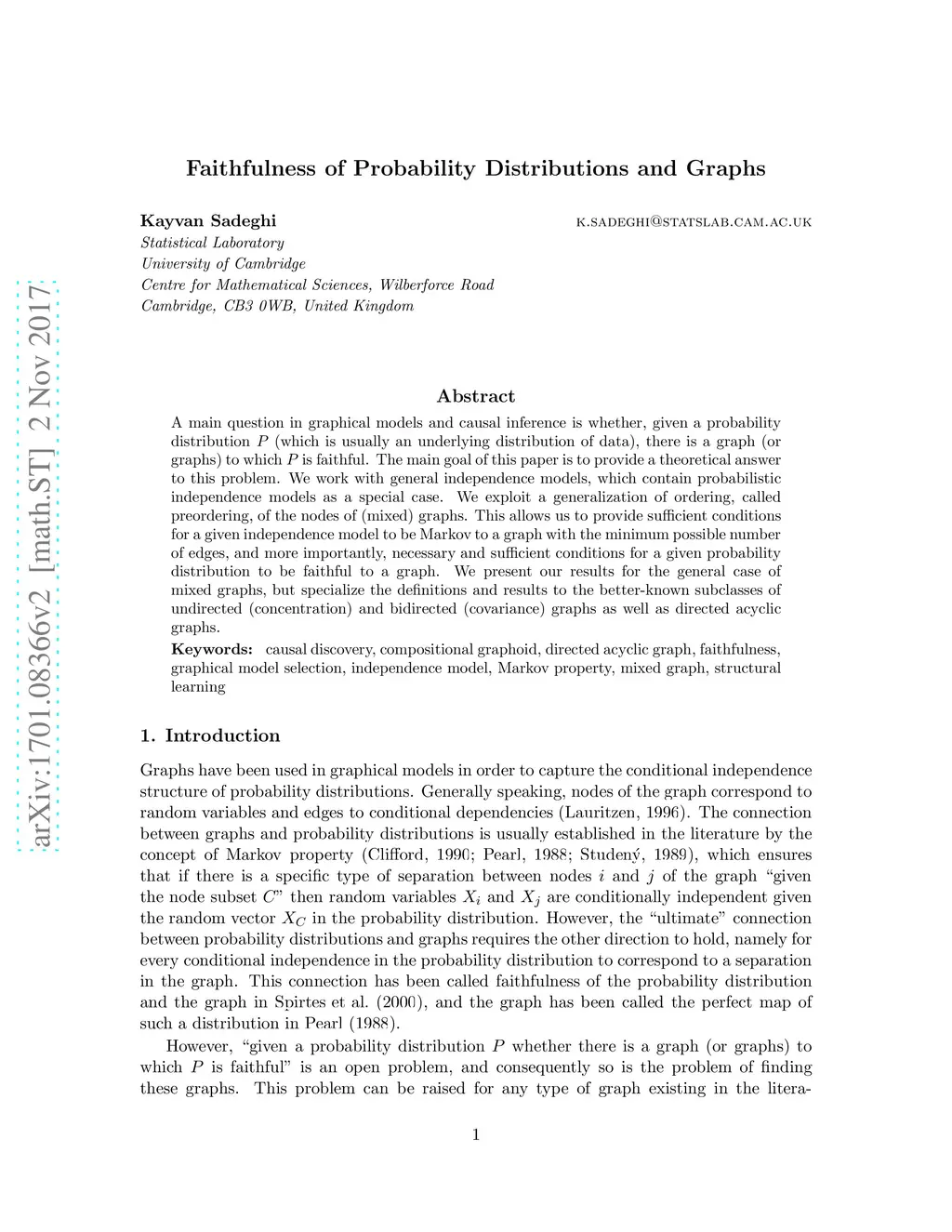 A main question in graphical models and causal inference is whether, given a probability distribution (which is usually an underlying distribution of data), there is a graph (or graphs) to which is faithful. The main goal of this paper is to provide a theoretical answer to this problem. We work with general independence models, which contain probabilistic independence models as a special case. We exploit a generalization of ordering, called preordering, of the nodes of (mixed) graphs. This allows us to provide sufficient conditions for a given independence model to be Markov to a graph with the minimum possible number of edges, and more importantly, necessary and sufficient conditions for a given probability distribution to be faithful to a graph. We present our results for the general case of mixed graphs, but specialize the definitions and results to the better-known subclasses of undirected (concentration) and bidirected (covariance) graphs as well as directed acyclic graphs.