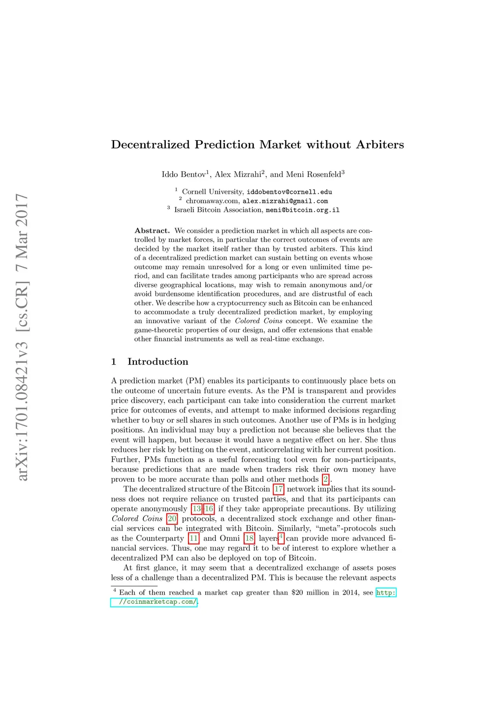 We consider a prediction market in which all aspects are controlled by market forces, in particular the correct outcomes of events are decided by the market itself rather than by trusted arbiters. This kind of a decentralized prediction market can sustain betting on events whose outcome may remain unresolved for a long or even unlimited time period, and can facilitate trades among participants who are spread across diverse geographical locations, may wish to remain anonymous and/or avoid burdensome identification procedures, and are distrustful of each other. We describe how a cryptocurrency such as Bitcoin can be enhanced to accommodate a truly decentralized prediction market, by employing an innovative variant of the Colored Coins concept. We examine the game-theoretic properties of our design, and offer extensions that enable other financial instruments as well as real-time exchange.