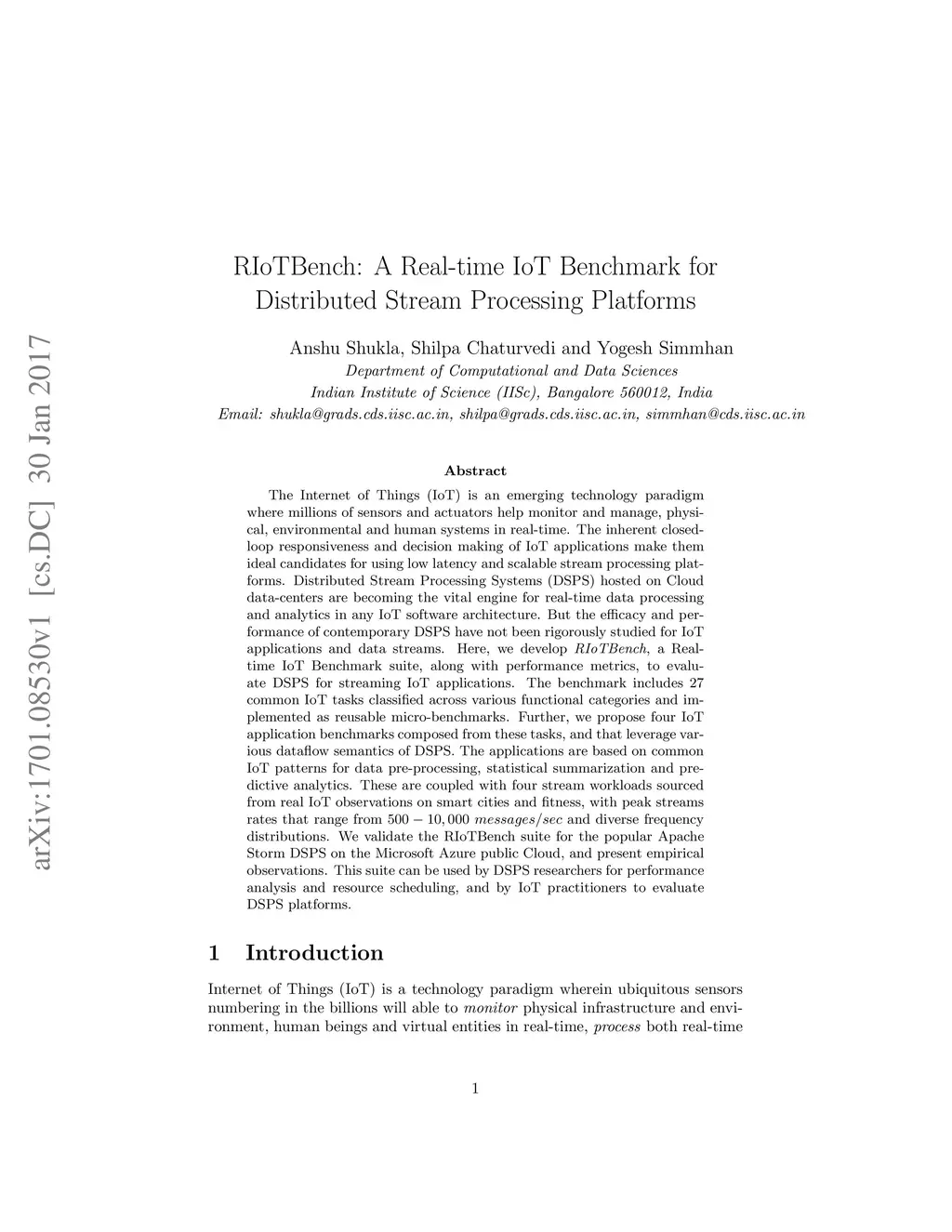 RIoTBench: A Real-time IoT Benchmark for Distributed Stream Processing