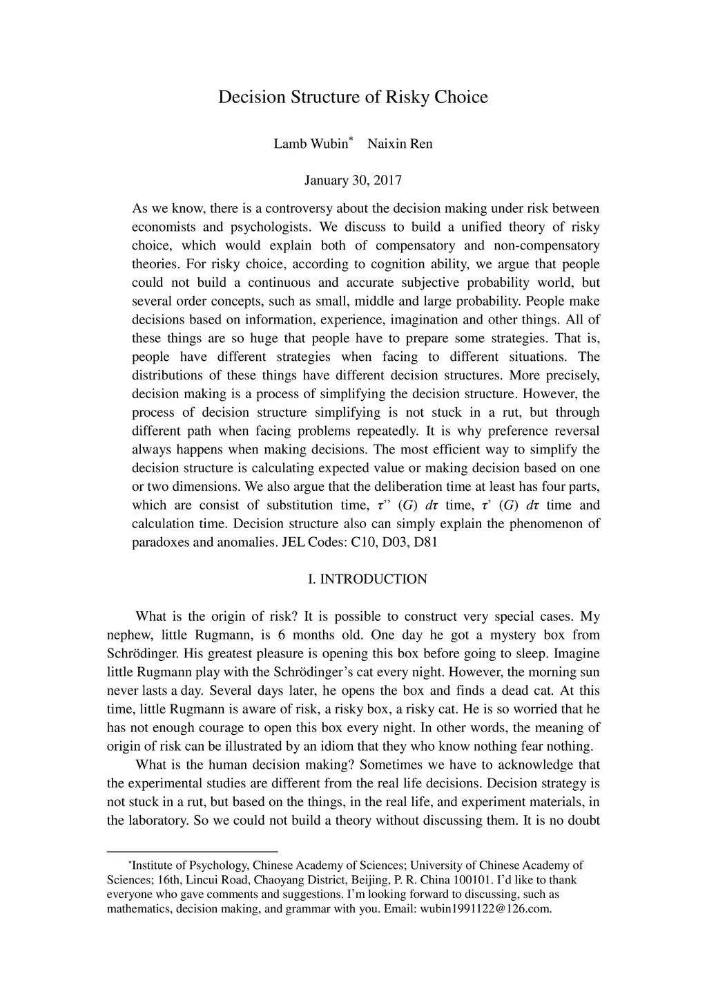 As we know, there is a controversy about the decision making under risk between economists and psychologists. We discuss to build a unified theory of risky choice, which would explain both of compensatory and non-compensatory theories. For risky choice, according to cognition ability, we argue that people could not build a continuous and accurate subjective probability world, but several order concepts, such as small, middle and large probability. People make decisions based on information, experience, imagination and other things. All of these things are so huge that people have to prepare some strategies. That is, people have different strategies when facing to different situations. The distributions of these things have different decision structures. More precisely, decision making is a process of simplifying the decision structure. However, the process of decision structure simplifying is not stuck in a rut, but through different path when facing problems repeatedly. It is why preference reversal always happens when making decisions. The most efficient way to simplify the decision structure is calculating expected value or making decisions based on one or two dimensions. We also argue that the deliberation time at least has four parts, which are consist of substitution time, first order time, second order time and calculation time. Decision structure also can simply explain the phenomenon of paradoxes and anomalies. JEL Codes: C10, D03, D81