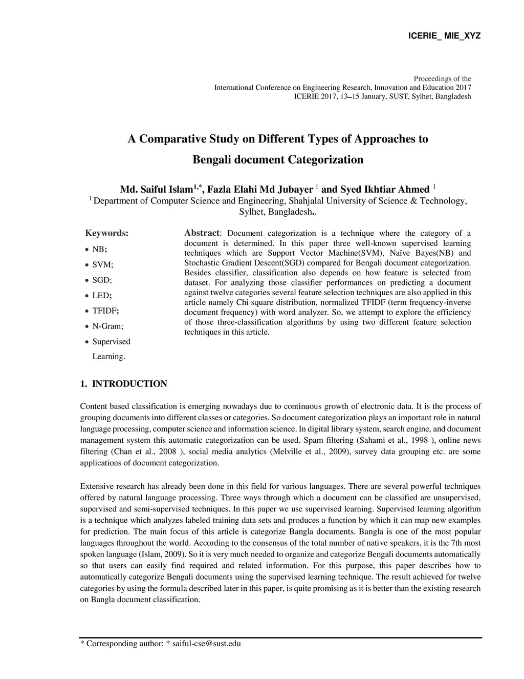 Document categorization is a technique where the category of a document is determined. In this paper three well-known supervised learning techniques which are Support Vector Machine(SVM), Na\"ive Bayes(NB) and Stochastic Gradient Descent(SGD) compared for Bengali document categorization. Besides classifier, classification also depends on how feature is selected from dataset. For analyzing those classifier performances on predicting a document against twelve categories several feature selection techniques are also applied in this article namely Chi square distribution, normalized TFIDF (term frequency-inverse document frequency) with word analyzer. So, we attempt to explore the efficiency of those three-classification algorithms by using two different feature selection techniques in this article.