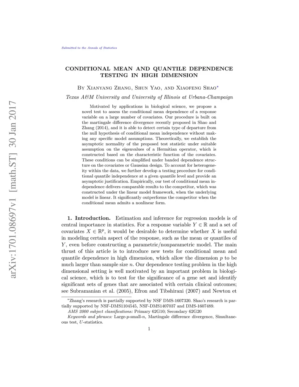 Motivated by applications in biological science, we propose a novel test to assess the conditional mean dependence of a response variable on a large number of covariates. Our procedure is built on the martingale difference divergence recently proposed in Shao and Zhang (2014), and it is able to detect a certain type of departure from the null hypothesis of conditional mean independence without making any specific model assumptions. Theoretically, we establish the asymptotic normality of the proposed test statistic under suitable assumption on the eigenvalues of a Hermitian operator, which is constructed based on the characteristic function of the covariates. These conditions can be simplified under banded dependence structure on the covariates or Gaussian design. To account for heterogeneity within the data, we further develop a testing procedure for conditional quantile independence at a given quantile level and provide an asymptotic justification. Empirically, our test of conditional mean independence delivers comparable results to the competitor, which was constructed under the linear model framework, when the underlying model is linear. It significantly outperforms the competitor when the conditional mean admits a nonlinear form.