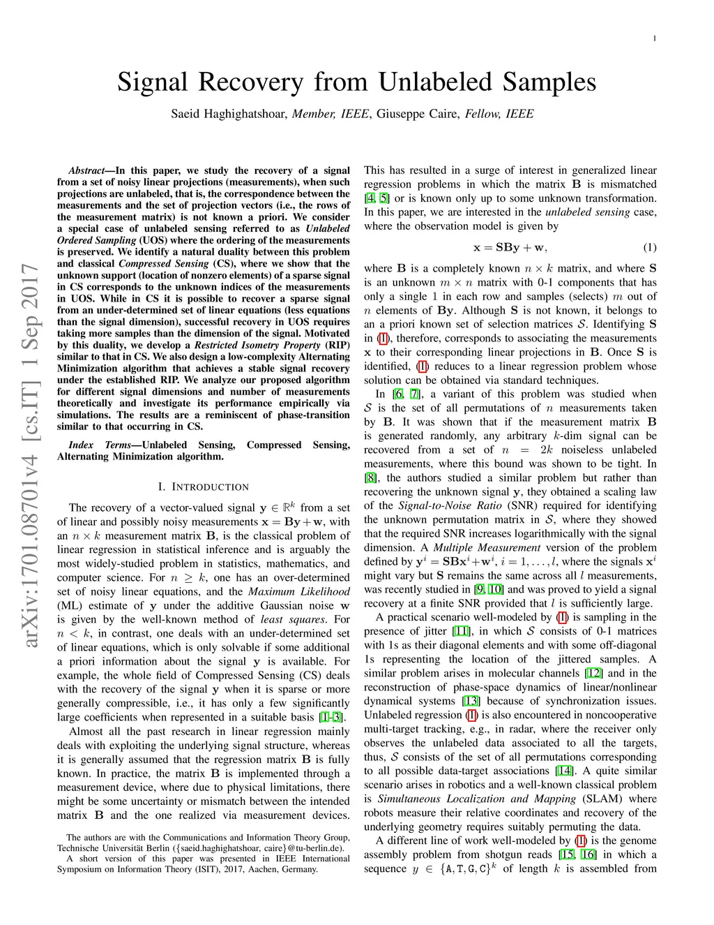 Signal Recovery from Unlabeled Samples