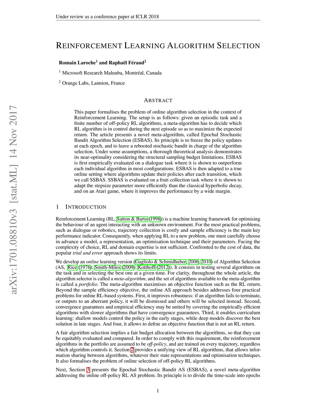 This paper formalises the problem of online algorithm selection in the context of Reinforcement Learning. The setup is as follows: given an episodic task and a finite number of off-policy RL algorithms, a meta-algorithm has to decide which RL algorithm is in control during the next episode so as to maximize the expected return. The article presents a novel meta-algorithm, called Epochal Stochastic Bandit Algorithm Selection (ESBAS). Its principle is to freeze the policy updates at each epoch, and to leave a rebooted stochastic bandit in charge of the algorithm selection. Under some assumptions, a thorough theoretical analysis demonstrates its near-optimality considering the structural sampling budget limitations. ESBAS is first empirically evaluated on a dialogue task where it is shown to outperform each individual algorithm in most configurations. ESBAS is then adapted to a true online setting where algorithms update their policies after each transition, which we call SSBAS. SSBAS is evaluated on a fruit collection task where it is shown to adapt the stepsize parameter more efficiently than the classical hyperbolic decay, and on an Atari game, where it improves the performance by a wide margin.