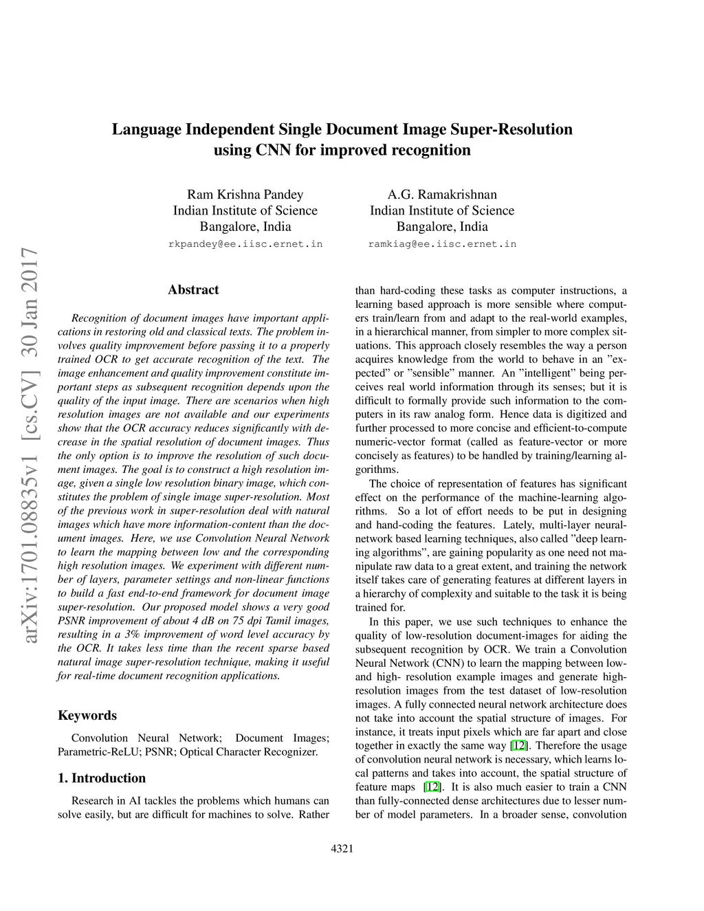 Language Independent Single Document Image Super-Resolution using CNN