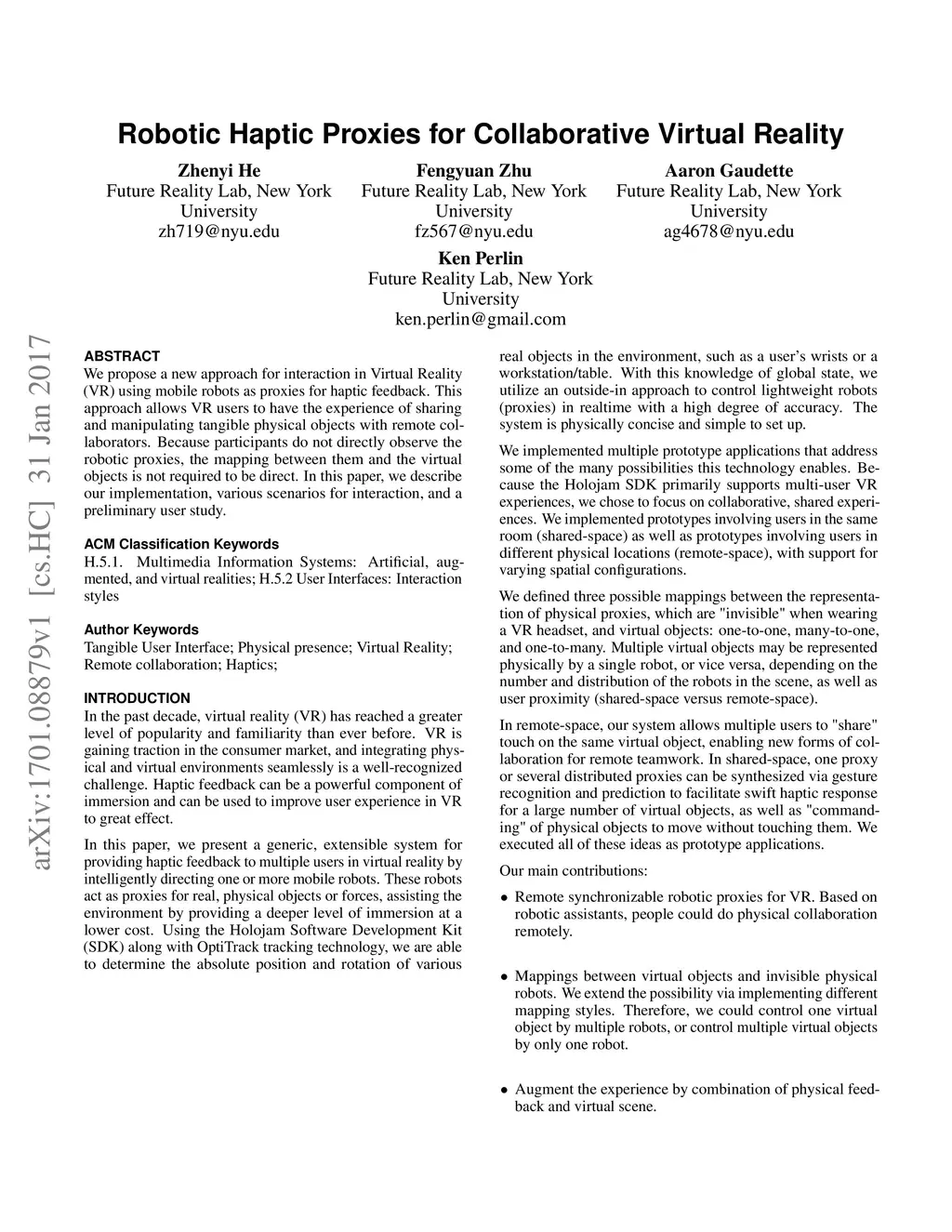 Robotic Haptic Proxies for Collaborative Virtual Reality