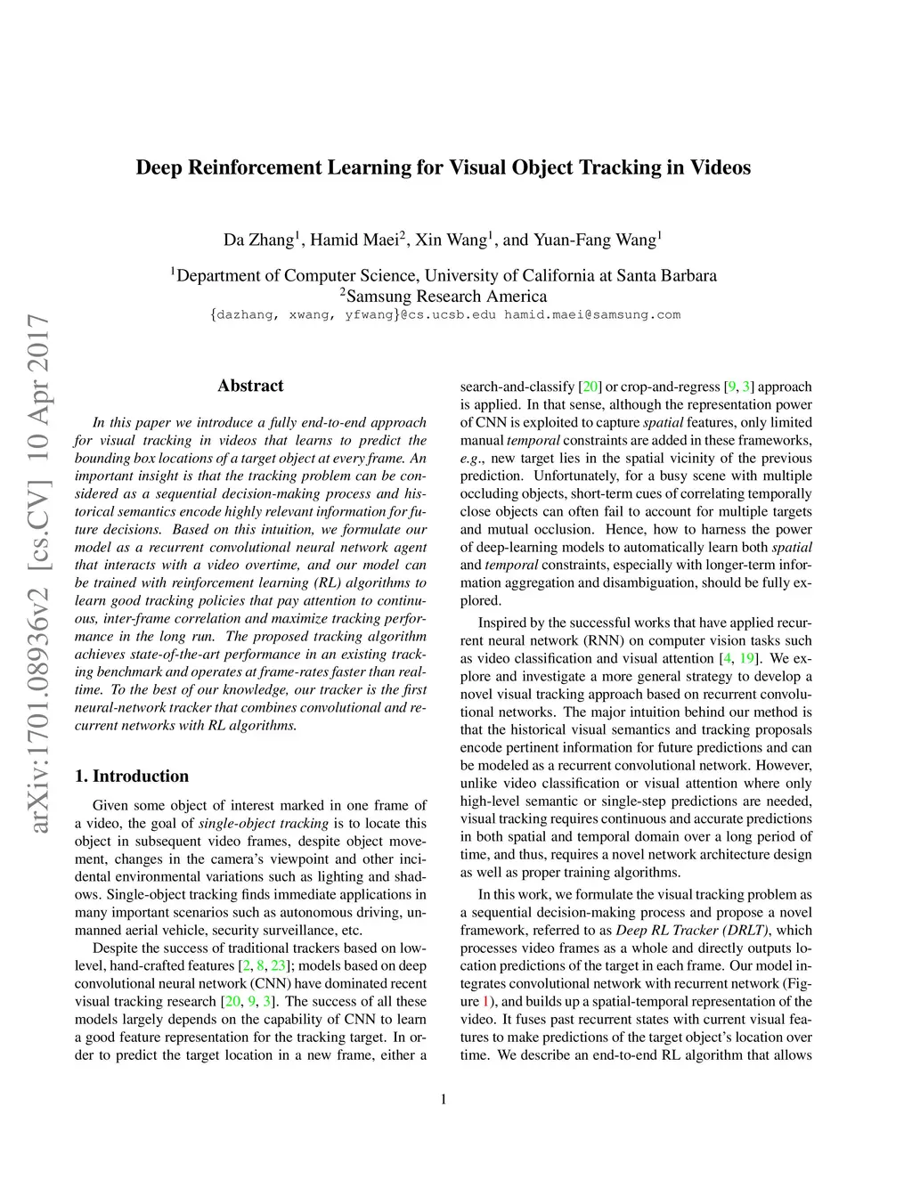 In this paper we introduce a fully end-to-end approach for visual tracking in videos that learns to predict the bounding box locations of a target object at every frame. An important insight is that the tracking problem can be considered as a sequential decision-making process and historical semantics encode highly relevant information for future decisions. Based on this intuition, we formulate our model as a recurrent convolutional neural network agent that interacts with a video overtime, and our model can be trained with reinforcement learning (RL) algorithms to learn good tracking policies that pay attention to continuous, inter-frame correlation and maximize tracking performance in the long run. The proposed tracking algorithm achieves state-of-the-art performance in an existing tracking benchmark and operates at frame-rates faster than real-time. To the best of our knowledge, our tracker is the first neural-network tracker that combines convolutional and recurrent networks with RL algorithms.