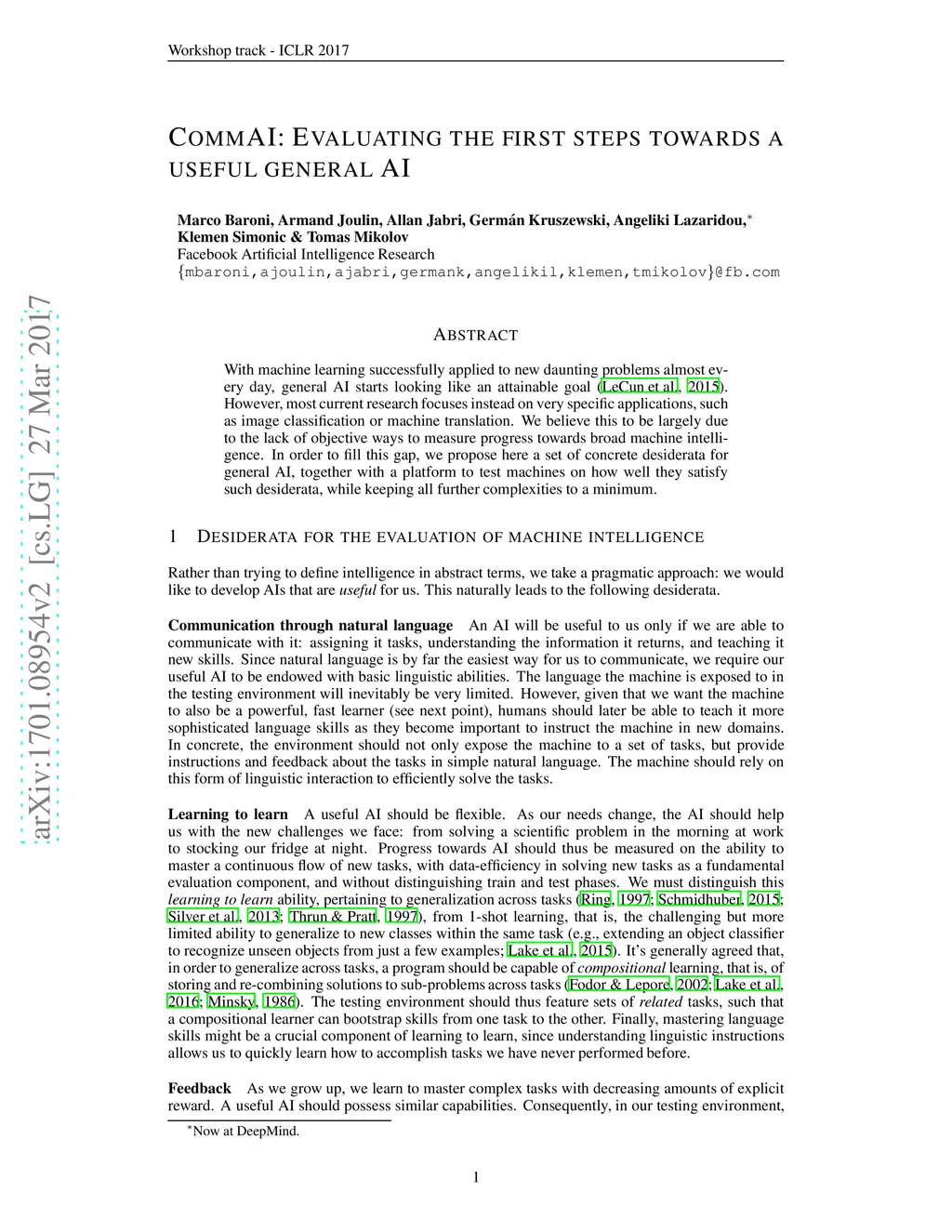 With machine learning successfully applied to new daunting problems almost every day, general AI starts looking like an attainable goal. However, most current research focuses instead on important but narrow applications, such as image classification or machine translation. We believe this to be largely due to the lack of objective ways to measure progress towards broad machine intelligence. In order to fill this gap, we propose here a set of concrete desiderata for general AI, together with a platform to test machines on how well they satisfy such desiderata, while keeping all further complexities to a minimum.