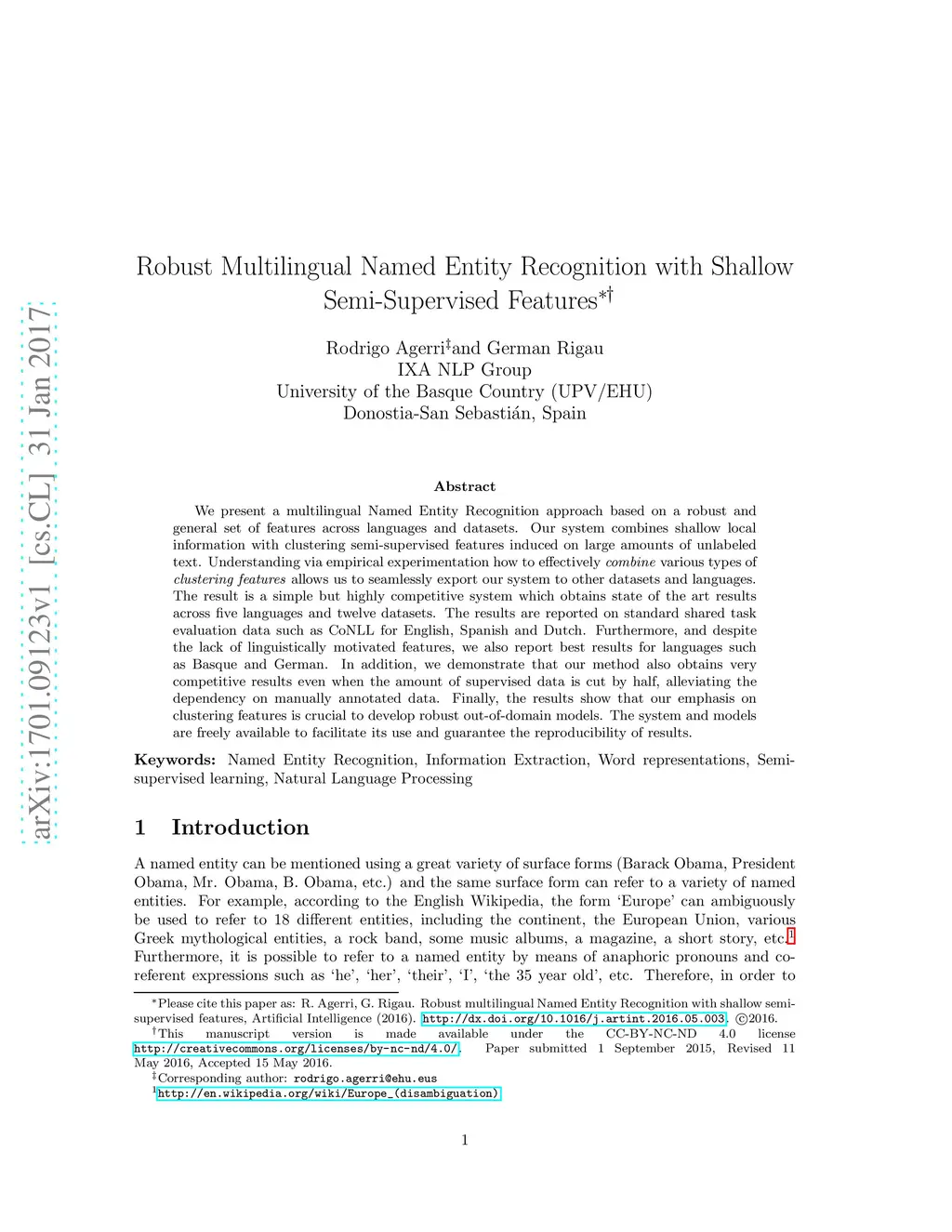 We present a multilingual Named Entity Recognition approach based on a robust and general set of features across languages and datasets. Our system combines shallow local information with clustering semi-supervised features induced on large amounts of unlabeled text. Understanding via empirical experimentation how to effectively combine various types of clustering features allows us to seamlessly export our system to other datasets and languages. The result is a simple but highly competitive system which obtains state of the art results across five languages and twelve datasets. The results are reported on standard shared task evaluation data such as CoNLL for English, Spanish and Dutch. Furthermore, and despite the lack of linguistically motivated features, we also report best results for languages such as Basque and German. In addition, we demonstrate that our method also obtains very competitive results even when the amount of supervised data is cut by half, alleviating the dependency on manually annotated data. Finally, the results show that our emphasis on clustering features is crucial to develop robust out-of-domain models. The system and models are freely available to facilitate its use and guarantee the reproducibility of results.