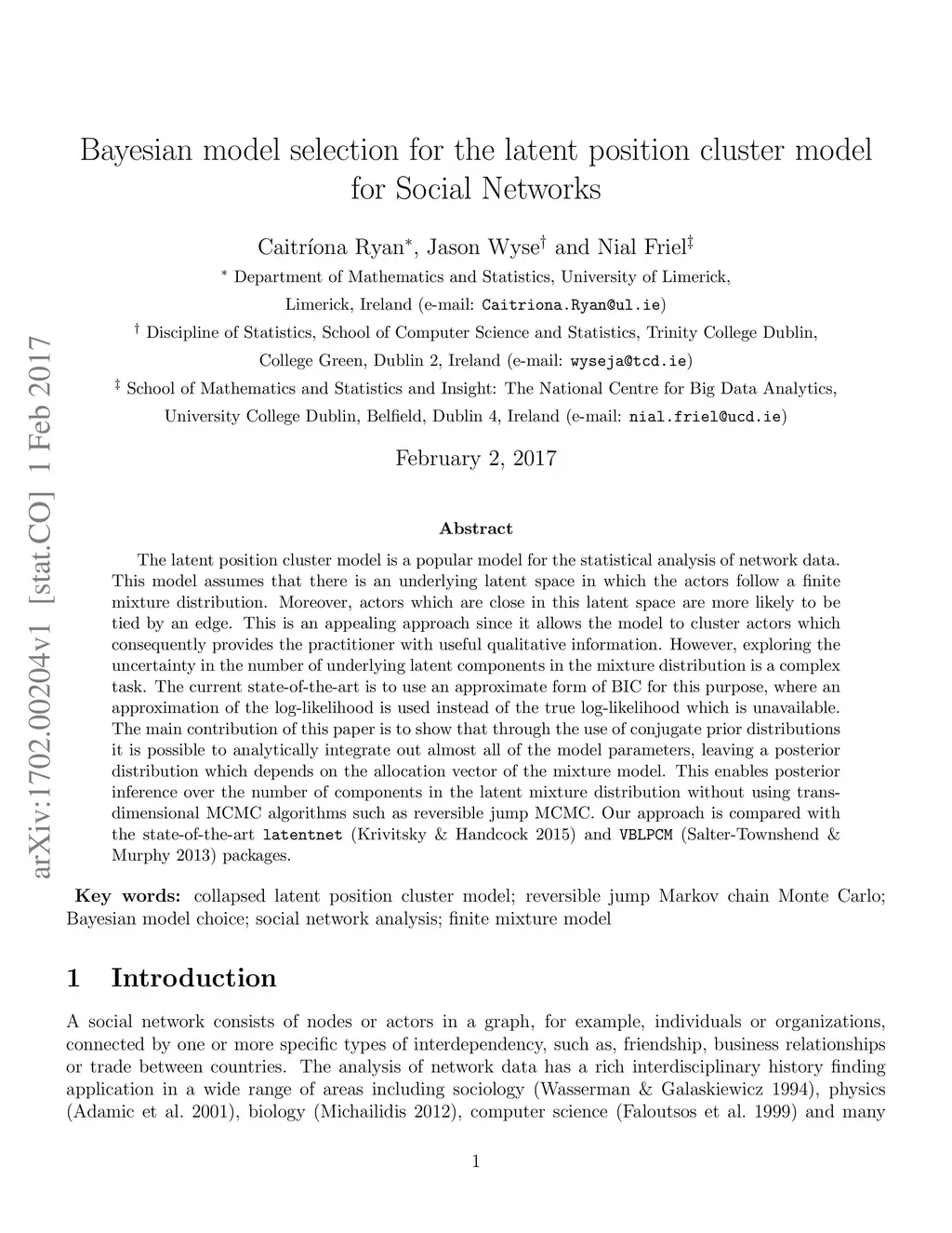 The latent position cluster model is a popular model for the statistical analysis of network data. This model assumes that there is an underlying latent space in which the actors follow a finite mixture distribution. Moreover, actors which are close in this latent space are more likely to be tied by an edge. This is an appealing approach since it allows the model to cluster actors which consequently provides the practitioner with useful qualitative information. However, exploring the uncertainty in the number of underlying latent components in the mixture distribution is a complex task. The current state-of-the-art is to use an approximate form of BIC for this purpose, where an approximation of the log-likelihood is used instead of the true log-likelihood which is unavailable. The main contribution of this paper is to show that through the use of conjugate prior distributions it is possible to analytically integrate out almost all of the model parameters, leaving a posterior distribution which depends on the allocation vector of the mixture model. This enables posterior inference over the number of components in the latent mixture distribution without using trans- dimensional MCMC algorithms such as reversible jump MCMC. Our approach is compared with the state-of-the-art latentnet (Krivitsky & Handcock 2015) and VBLPCM (Salter-Townshend & Murphy 2013) packages.