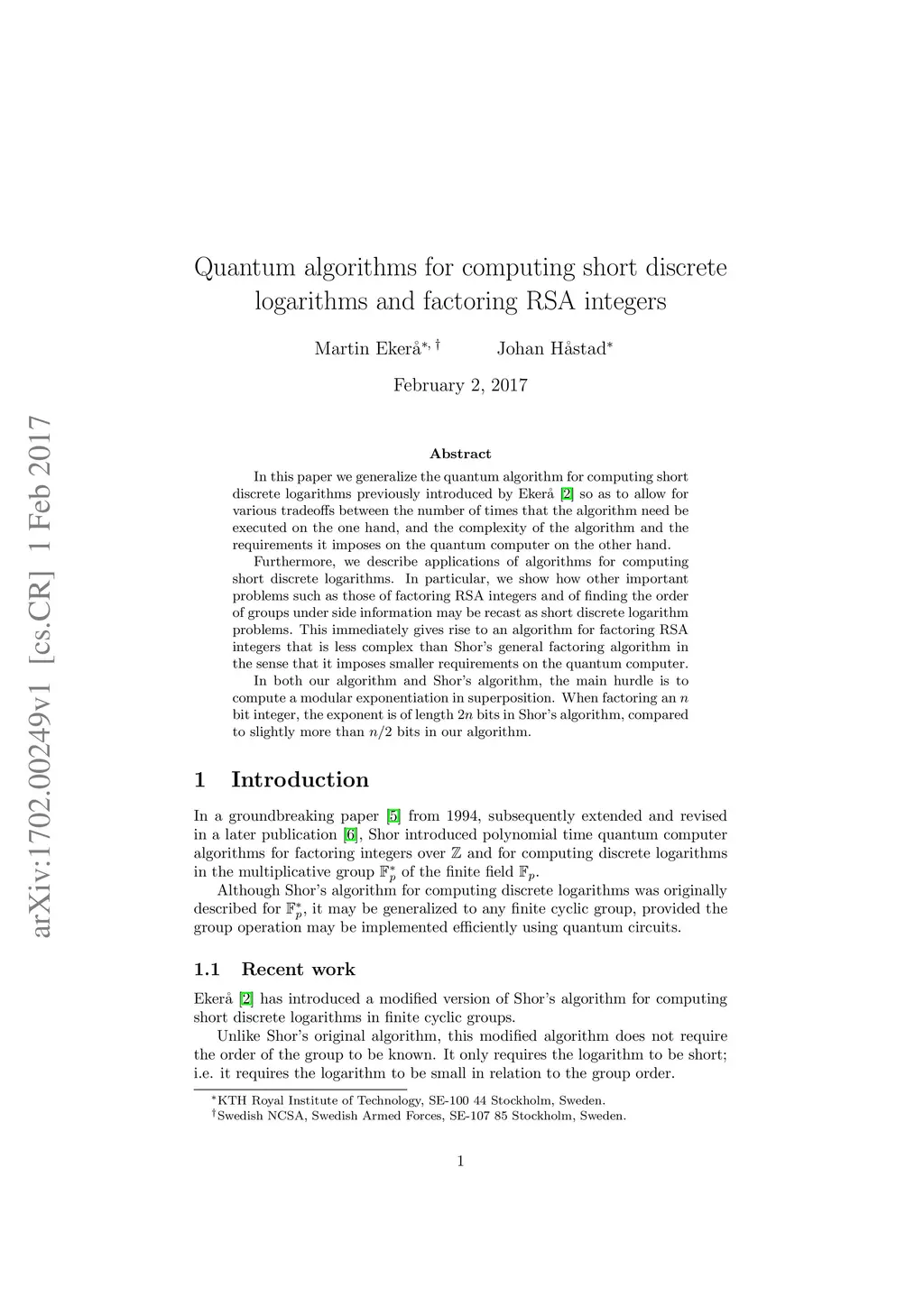 In this paper we generalize the quantum algorithm for computing short discrete logarithms previously introduced by Eker{\aa} so as to allow for various tradeoffs between the number of times that the algorithm need be executed on the one hand, and the complexity of the algorithm and the requirements it imposes on the quantum computer on the other hand. Furthermore, we describe applications of algorithms for computing short discrete logarithms. In particular, we show how other important problems such as those of factoring RSA integers and of finding the order of groups under side information may be recast as short discrete logarithm problems. This immediately gives rise to an algorithm for factoring RSA integers that is less complex than Shor's general factoring algorithm in the sense that it imposes smaller requirements on the quantum computer. In both our algorithm and Shor's algorithm, the main hurdle is to compute a modular exponentiation in superposition. When factoring an n bit integer, the exponent is of length 2n bits in Shor's algorithm, compared to slightly more than n/2 bits in our algorithm.