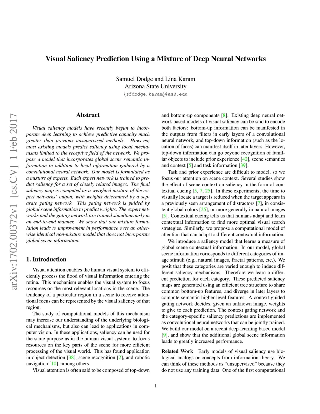 Visual saliency models have recently begun to incorporate deep learning to achieve predictive capacity much greater than previous unsupervised methods. However, most existing models predict saliency using local mechanisms limited to the receptive field of the network. We propose a model that incorporates global scene semantic information in addition to local information gathered by a convolutional neural network. Our model is formulated as a mixture of experts. Each expert network is trained to predict saliency for a set of closely related images. The final saliency map is computed as a weighted mixture of the expert networks' output, with weights determined by a separate gating network. This gating network is guided by global scene information to predict weights. The expert networks and the gating network are trained simultaneously in an end-to-end manner. We show that our mixture formulation leads to improvement in performance over an otherwise identical non-mixture model that does not incorporate global scene information.