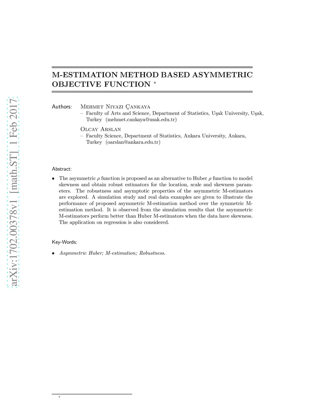 The asymmetric objective function is proposed as an alternative to Huber objective function to model skewness and obtain robust estimators for the location, scale and skewness parameters. The robustness and asymptotic properties of the asymmetric M-estimators are explored. A simulation study and real data examples are given to illustrate the performance of proposed asymmetric M-estimation method over the symmetric M-estimation method. It is observed from the simulation results that the asymmetric M-estimators perform better than Huber M-estimators when the data have skewness. The application on regression is also considered.