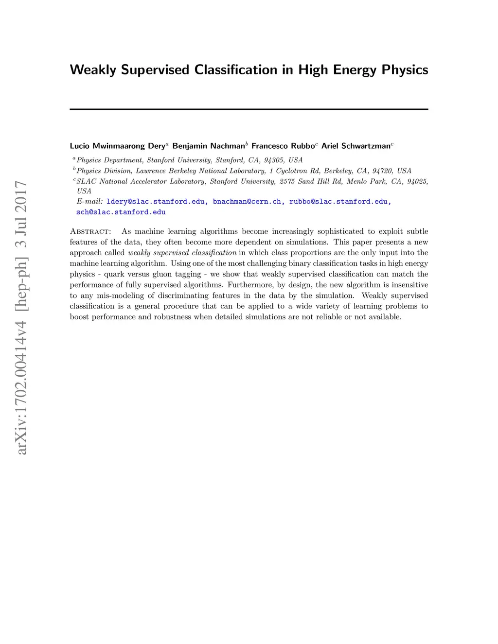 As machine learning algorithms become increasingly sophisticated to exploit subtle features of the data, they often become more dependent on simulations. This paper presents a new approach called weakly supervised classification in which class proportions are the only input into the machine learning algorithm. Using one of the most challenging binary classification tasks in high energy physics - quark versus gluon tagging - we show that weakly supervised classification can match the performance of fully supervised algorithms. Furthermore, by design, the new algorithm is insensitive to any mis-modeling of discriminating features in the data by the simulation. Weakly supervised classification is a general procedure that can be applied to a wide variety of learning problems to boost performance and robustness when detailed simulations are not reliable or not available.