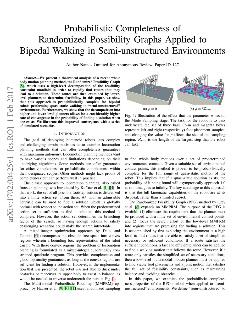 We present a theoretical analysis of a recent whole body motion planning method, the Randomized Possibility Graph, which uses a high-level decomposition of the feasibility constraint manifold in order to rapidly find routes that may lead to a solution. These routes are then examined by lower-level planners to determine feasibility. In this paper, we show that this approach is probabilistically complete for bipedal robots performing quasi-static walking in "semi-unstructured" environments. Furthermore, we show that the decomposition into higher and lower level planners allows for a considerably higher rate of convergence in the probability of finding a solution when one exists. We illustrate this improved convergence with a series of simulated scenarios.