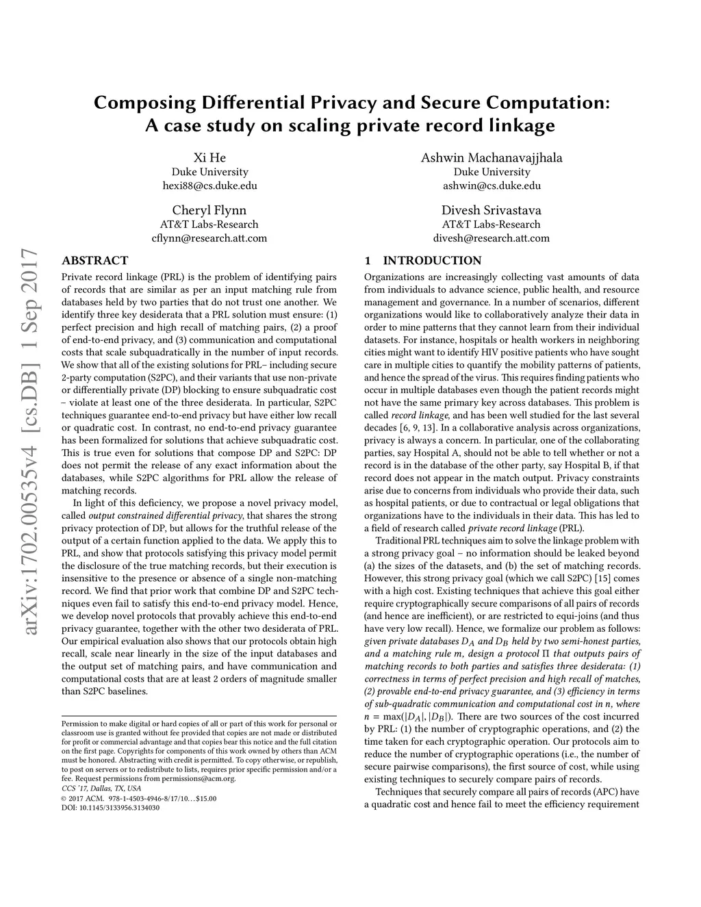 Private record linkage (PRL) is the problem of identifying pairs of records that are similar as per an input matching rule from databases held by two parties that do not trust one another. We identify three key desiderata that a PRL solution must ensure: 1) perfect precision and high recall of matching pairs, 2) a proof of end-to-end privacy, and 3) communication and computational costs that scale subquadratically in the number of input records. We show that all of the existing solutions for PRL - including secure 2-party computation (S2PC), and their variants that use non-private or differentially private (DP) blocking to ensure subquadratic cost - violate at least one of the three desiderata. In particular, S2PC techniques guarantee end-to-end privacy but have either low recall or quadratic cost. In contrast, no end-to-end privacy guarantee has been formalized for solutions that achieve subquadratic cost. This is true even for solutions that compose DP and S2PC: DP does not permit the release of any exact information about the databases, while S2PC algorithms for PRL allow the release of matching records. In light of this deficiency, we propose a novel privacy model, called output constrained differential privacy, that shares the strong privacy protection of DP, but allows for the truthful release of the output of a certain function applied to the data. We apply this to PRL, and show that protocols satisfying this privacy model permit the disclosure of the true matching records, but their execution is insensitive to the presence or absence of a single non-matching record. We find that prior work that combine DP and S2PC techniques even fail to satisfy this end-to-end privacy model. Hence, we develop novel protocols that provably achieve this end-to-end privacy guarantee, together with the other two desiderata of PRL.