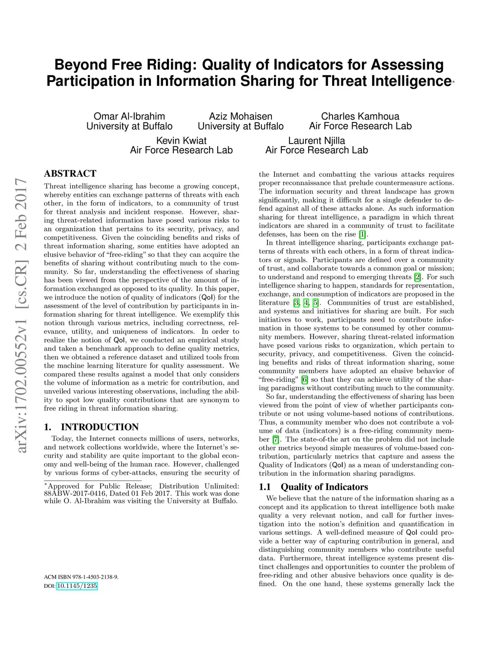 Threat intelligence sharing has become a growing concept, whereby entities can exchange patterns of threats with each other, in the form of indicators, to a community of trust for threat analysis and incident response. However, sharing threat-related information have posed various risks to an organization that pertains to its security, privacy, and competitiveness. Given the coinciding benefits and risks of threat information sharing, some entities have adopted an elusive behavior of "free-riding" so that they can acquire the benefits of sharing without contributing much to the community. So far, understanding the effectiveness of sharing has been viewed from the perspective of the amount of information exchanged as opposed to its quality. In this paper, we introduce the notion of quality of indicators (\qoi) for the assessment of the level of contribution by participants in information sharing for threat intelligence. We exemplify this notion through various metrics, including correctness, relevance, utility, and uniqueness of indicators. In order to realize the notion of \qoi, we conducted an empirical study and taken a benchmark approach to define quality metrics, then we obtained a reference dataset and utilized tools from the machine learning literature for quality assessment. We compared these results against a model that only considers the volume of information as a metric for contribution, and unveiled various interesting observations, including the ability to spot low quality contributions that are synonym to free riding in threat information sharing.