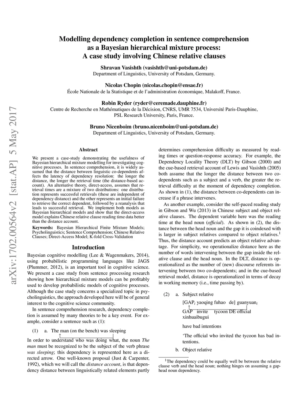 hierarchical mixture process: A case study involving Chinese relative clauses