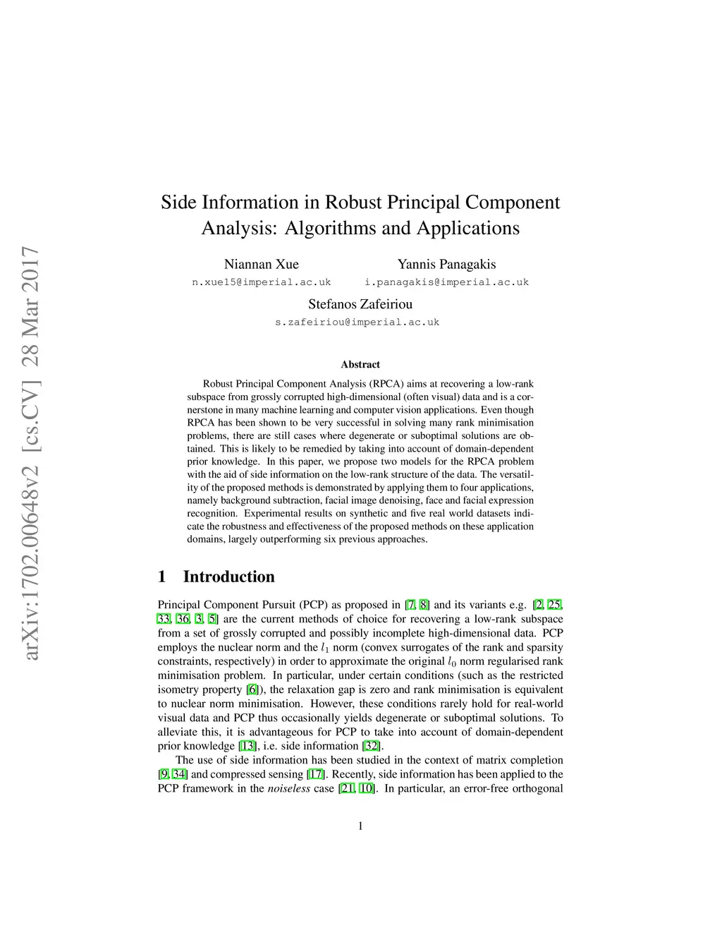 Robust Principal Component Analysis (RPCA) aims at recovering a low-rank subspace from grossly corrupted high-dimensional (often visual) data and is a cornerstone in many machine learning and computer vision applications. Even though RPCA has been shown to be very successful in solving many rank minimisation problems, there are still cases where degenerate or suboptimal solutions are obtained. This is likely to be remedied by taking into account of domain-dependent prior knowledge. In this paper, we propose two models for the RPCA problem with the aid of side information on the low-rank structure of the data. The versatility of the proposed methods is demonstrated by applying them to four applications, namely background subtraction, facial image denoising, face and facial expression recognition. Experimental results on synthetic and five real world datasets indicate the robustness and effectiveness of the proposed methods on these application domains, largely outperforming six previous approaches.