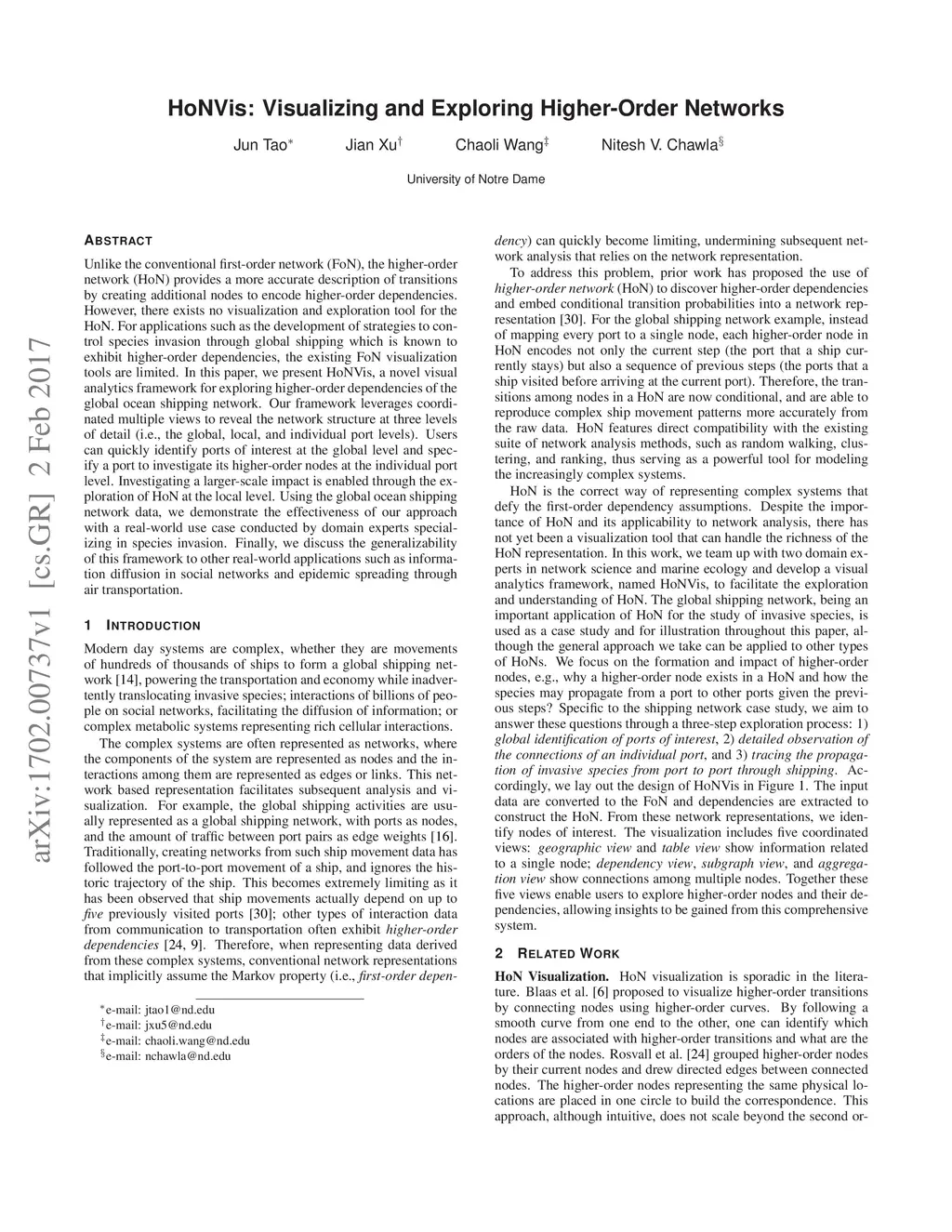 Unlike the conventional first-order network (FoN), the higher-order network (HoN) provides a more accurate description of transitions by creating additional nodes to encode higher-order dependencies. However, there exists no visualization and exploration tool for the HoN. For applications such as the development of strategies to control species invasion through global shipping which is known to exhibit higher-order dependencies, the existing FoN visualization tools are limited. In this paper, we present HoNVis, a novel visual analytics framework for exploring higher-order dependencies of the global ocean shipping network. Our framework leverages coordinated multiple views to reveal the network structure at three levels of detail (i.e., the global, local, and individual port levels). Users can quickly identify ports of interest at the global level and specify a port to investigate its higher-order nodes at the individual port level. Investigating a larger-scale impact is enabled through the exploration of HoN at the local level. Using the global ocean shipping network data, we demonstrate the effectiveness of our approach with a real-world use case conducted by domain experts specializing in species invasion. Finally, we discuss the generalizability of this framework to other real-world applications such as information diffusion in social networks and epidemic spreading through air transportation.