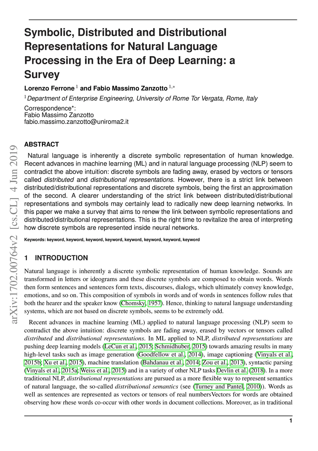 Natural language is inherently a discrete symbolic representation of human knowledge. Recent advances in machine learning (ML) and in natural language processing (NLP) seem to contradict the above intuition: discrete symbols are fading away, erased by vectors or tensors called distributed and distributional representations. However, there is a strict link between distributed/distributional representations and discrete symbols, being the first an approximation of the second. A clearer understanding of the strict link between distributed/distributional representations and symbols may certainly lead to radically new deep learning networks. In this paper we make a survey that aims to renew the link between symbolic representations and distributed/distributional representations. This is the right time to revitalize the area of interpreting how discrete symbols are represented inside neural networks.