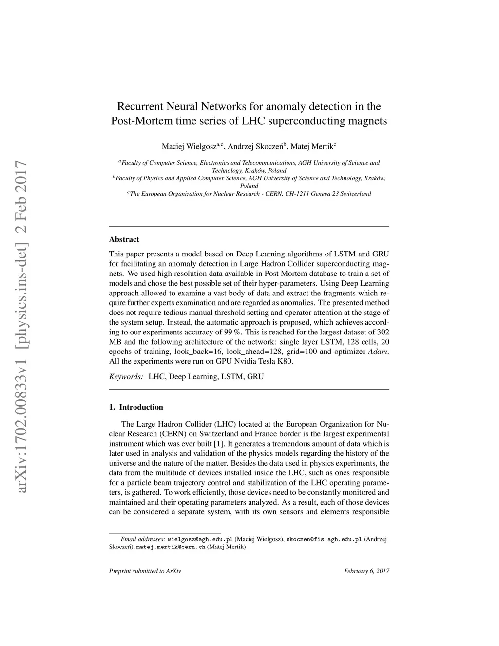This paper presents a model based on Deep Learning algorithms of LSTM and GRU for facilitating an anomaly detection in Large Hadron Collider superconducting magnets. We used high resolution data available in Post Mortem database to train a set of models and chose the best possible set of their hyper-parameters. Using Deep Learning approach allowed to examine a vast body of data and extract the fragments which require further experts examination and are regarded as anomalies. The presented method does not require tedious manual threshold setting and operator attention at the stage of the system setup. Instead, the automatic approach is proposed, which achieves according to our experiments accuracy of 99%. This is reached for the largest dataset of 302 MB and the following architecture of the network: single layer LSTM, 128 cells, 20 epochs of training, look_back=16, look_ahead=128, grid=100 and optimizer Adam. All the experiments were run on GPU Nvidia Tesla K80