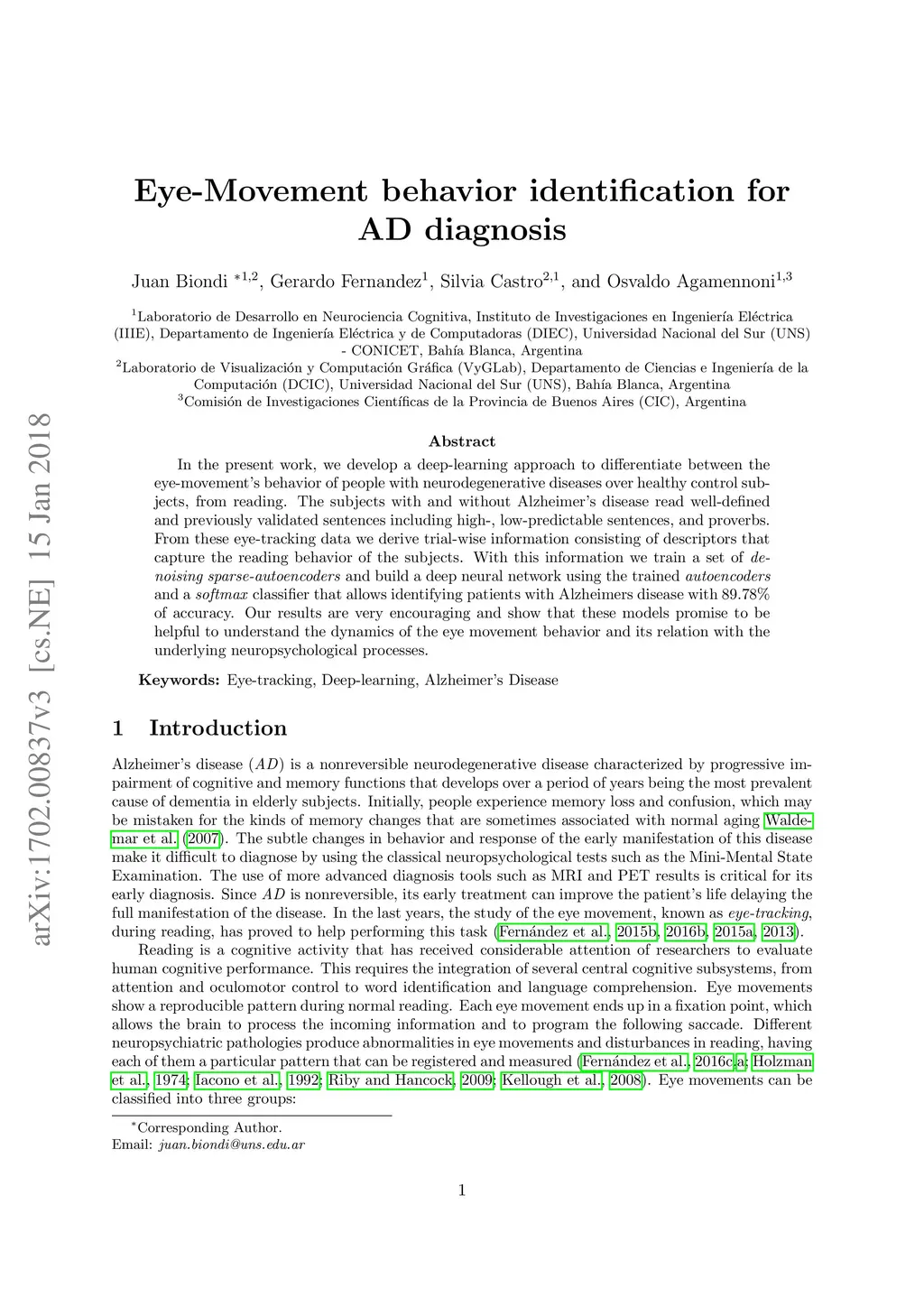 In the present work, we develop a deep-learning approach for differentiating the eye-movement behavior of people with neurodegenerative diseases over healthy control subjects during reading well-defined sentences. We define an information compaction of the eye-tracking data of subjects without and with probable Alzheimer's disease when reading a set of well-defined, previously validated, sentences including high-, low-predictable sentences, and proverbs. Using this information we train a set of denoising sparse-autoencoders and build a deep neural network with these and a softmax classifier. Our results are very promising and show that these models may help to understand the dynamics of eye movement behavior and its relationship with underlying neuropsychological correlates.